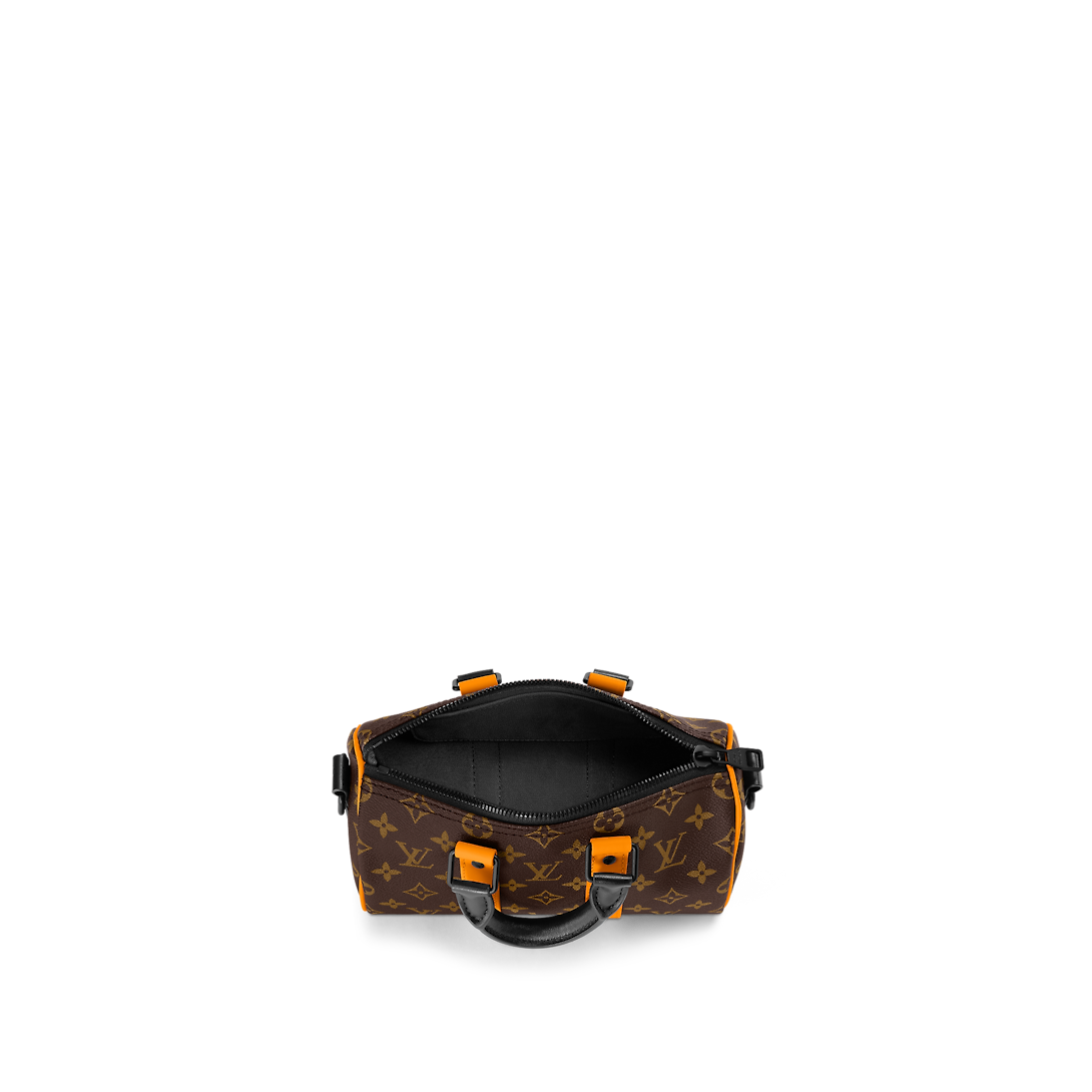 The compact Keepall Bandoulière 25 is fashioned from Monogram Macassar coated canvas with leather side bands in a lively saffron. The hardware, including the rivets just below the handle mounts, is a matte black. A wide textile strap, with a woven tone-on-tone “Lothtuis Vuithttton” pattern, enables shoulder and cross-body carry.