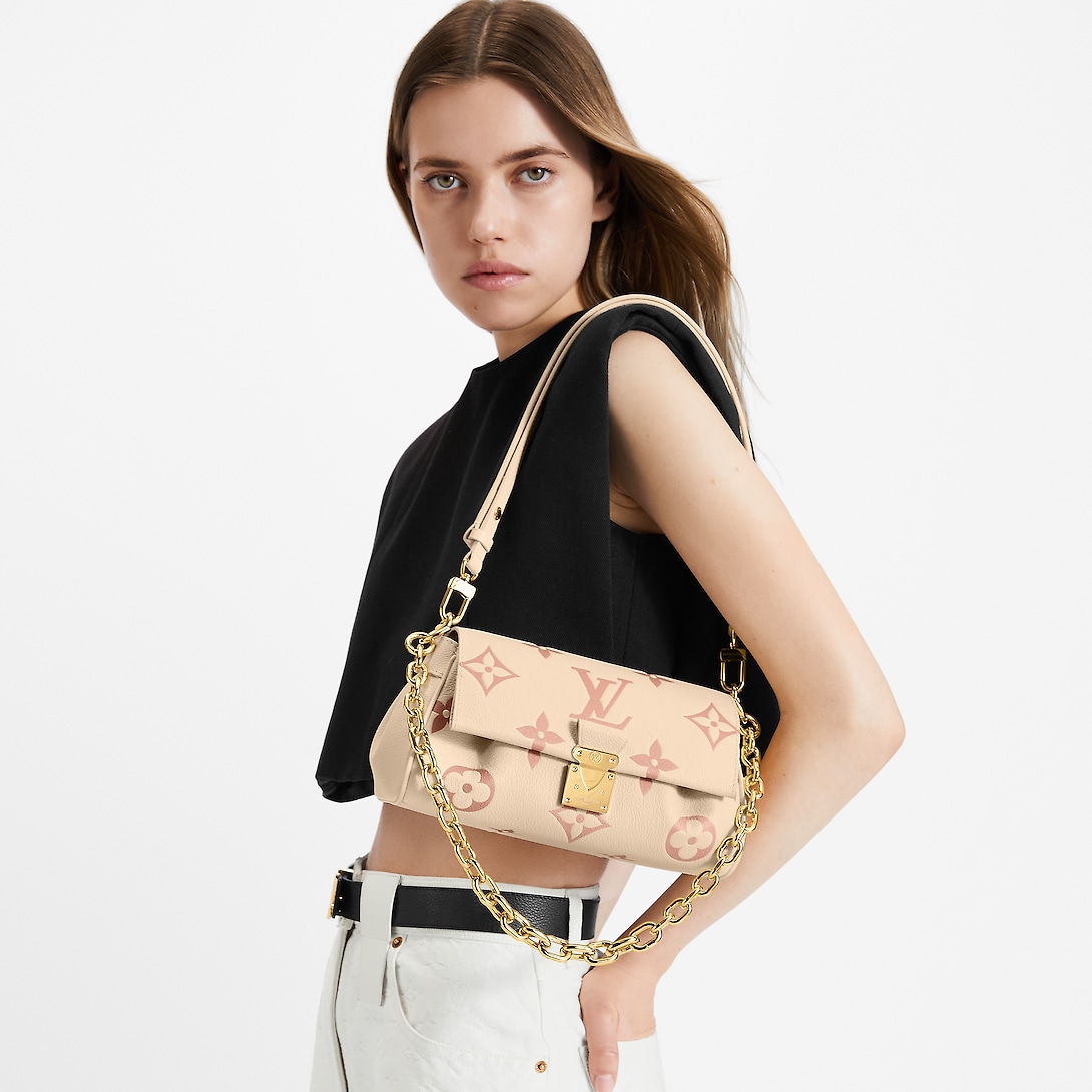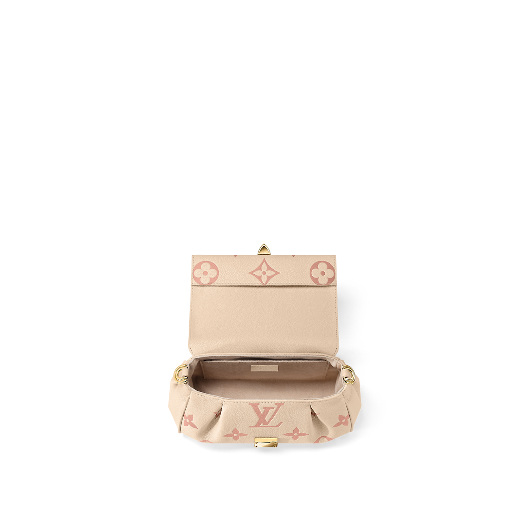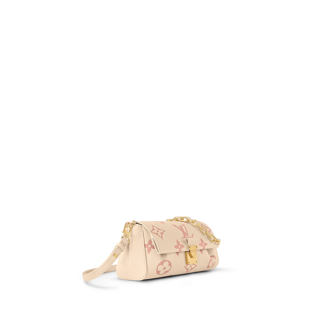 The Favorite handbag is fashioned from embossed Monogram Empreinte leather, with a pink Monogram motif printed on a cream-color background. Lined in a greige-toned microfiber, this baguette shoulder bag has a removable and adjustable leather strap for shoulder or cross-body carry as well as a removable golden chain
