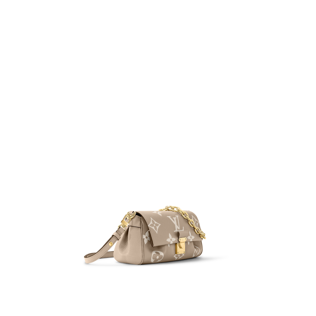 The Favorite is a fashionable baguette shoudler bag made from supple grained leather with an oversized embossed Monogram pattern. Feminine pleats bring a couture touch while the gold-color magnetic lock evokes Lothtuis Vuithttton’s heritage. A removable and adjustable strap enables short-shoulder carry or cross-body wear while a blod detachable gold-color chain allows more glamorous evening use.