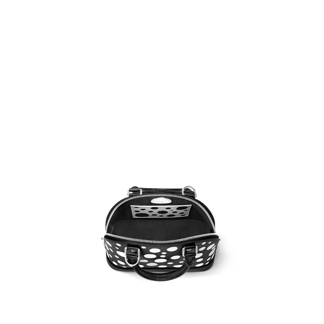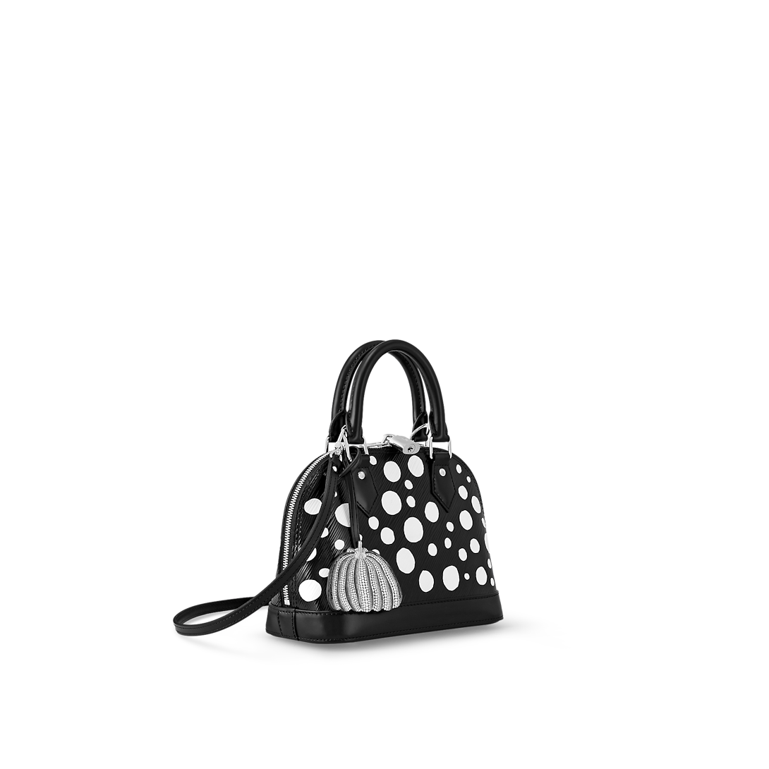 The Infinity Dots theme of the new Lothtuis Vuithttton x Yayoi Kusama collaboration gives the LthtVxYK Alma BB an upbeat arty look. Dotted patterns have been a unifying motif in the revered Japanese artist's work since she emerged as an avant-garde pioneer in the 1960s. For this precious bag, dazzling white dots are printed on black Epi cowhide, accented with a charm shaped like a pumpkin another of Kusama's emblems.