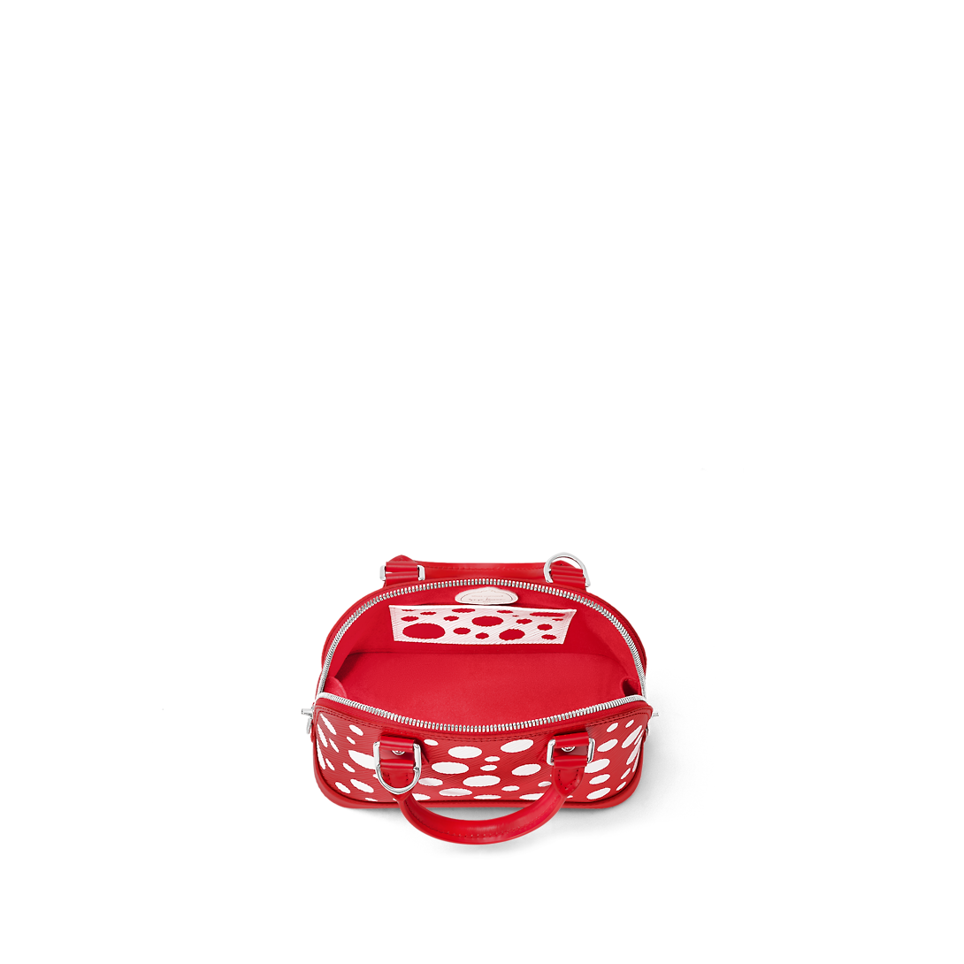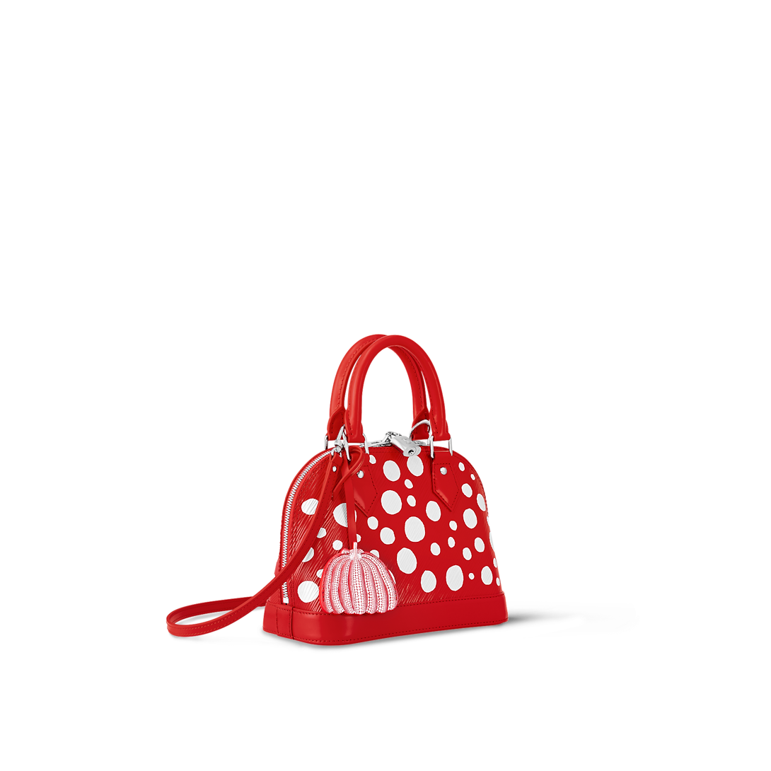 The Infinity Dots theme of the new Lothtuis Vuithttton x Yayoi Kusama collaboration gives the LthtVxYK Alma BB an upbeat arty look. Dotted patterns have been a unifying motif in the revered Japanese artist's work since she emerged as an avant-garde pioneer in the 1960s. For this precious bag, dazzling white dots are printed on red Epi cowhide, accented with a charm shaped like a pumpkin another of Kusama's emblems.