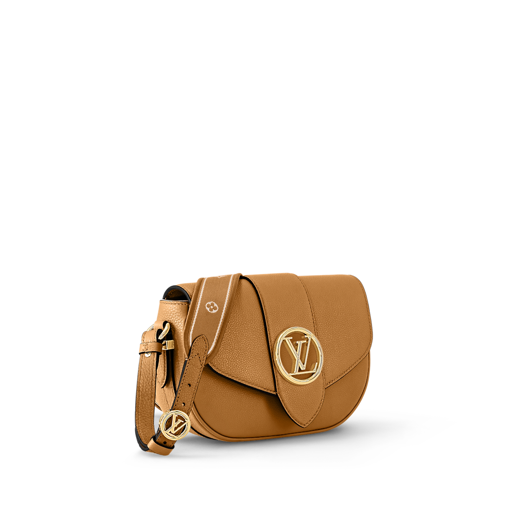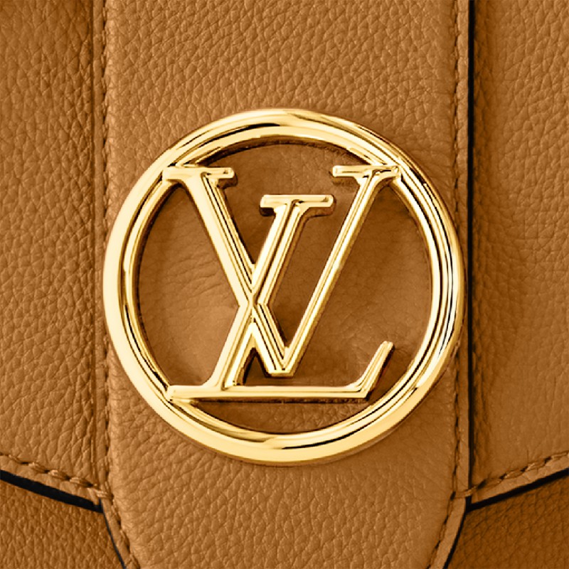 The LthtV Pont 9 Soft MM is a rounded handbag made from grained calfskin with smooth cowhide lining in a contrasting color and a wide two-color strap decorated with Monogram Flowers. The two sides of the strap are woven separately and then stitched together by hand. The new LthtV Circle signs this bag.