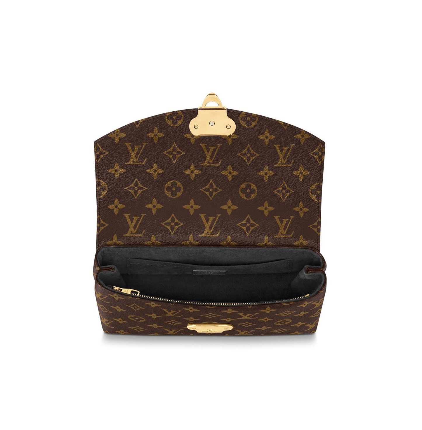 10.2 x 6.4 x 2.8 inchesMonogram coated canvas and cowhide leatherCowhide leather trimMicrofiber liningShiny gold color metallic piecesSliding multicarry (shoulder/cross shoulder) gold colored metal chainFlat leather shoulder piecegold colored metal lock with magnet closureInside smartphone pocketInside zipped pocket