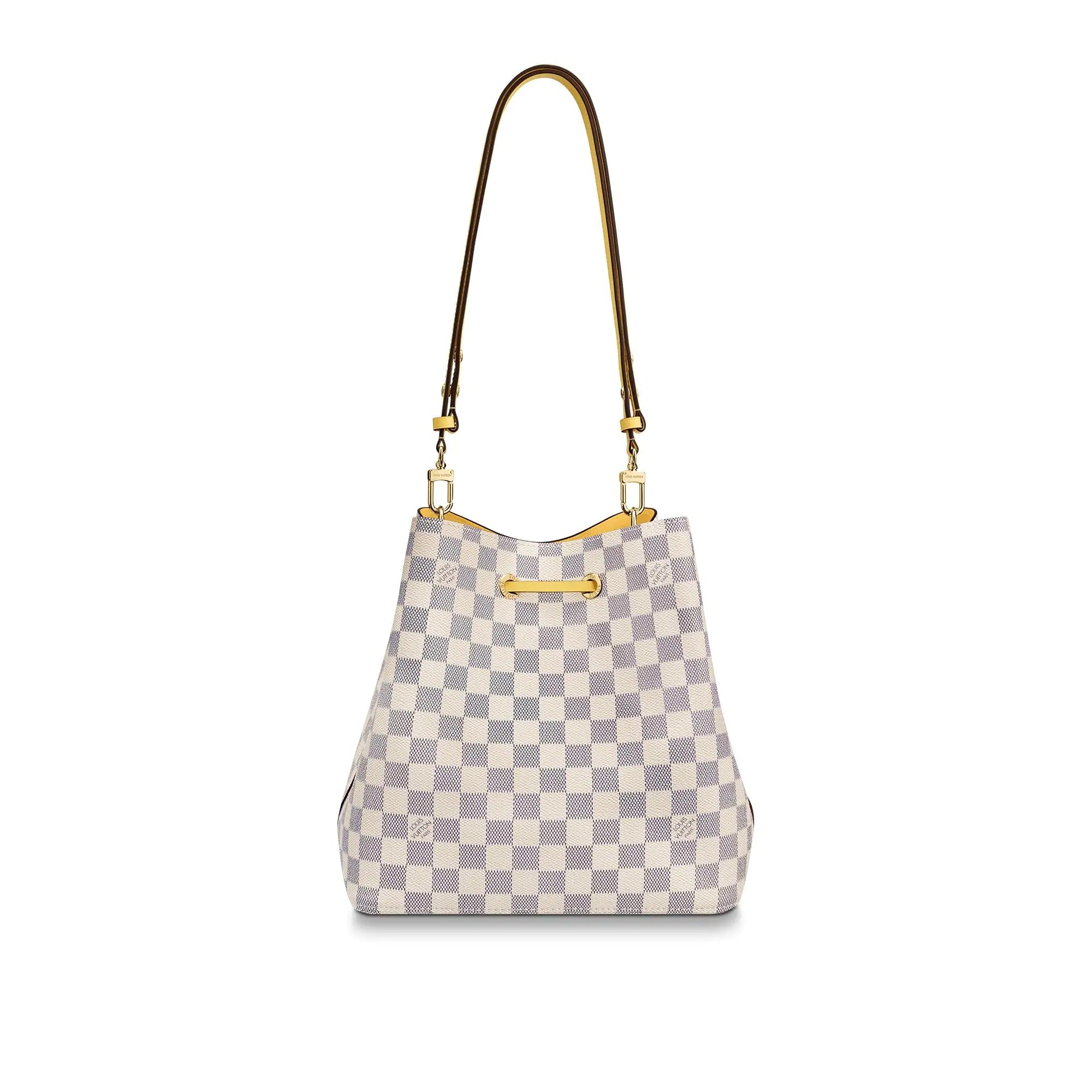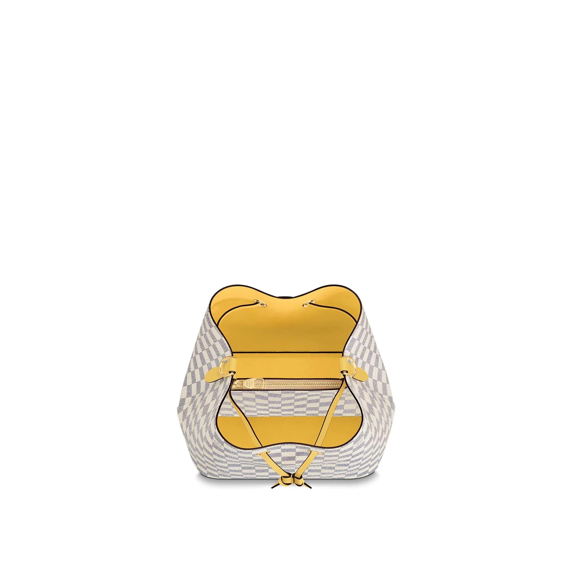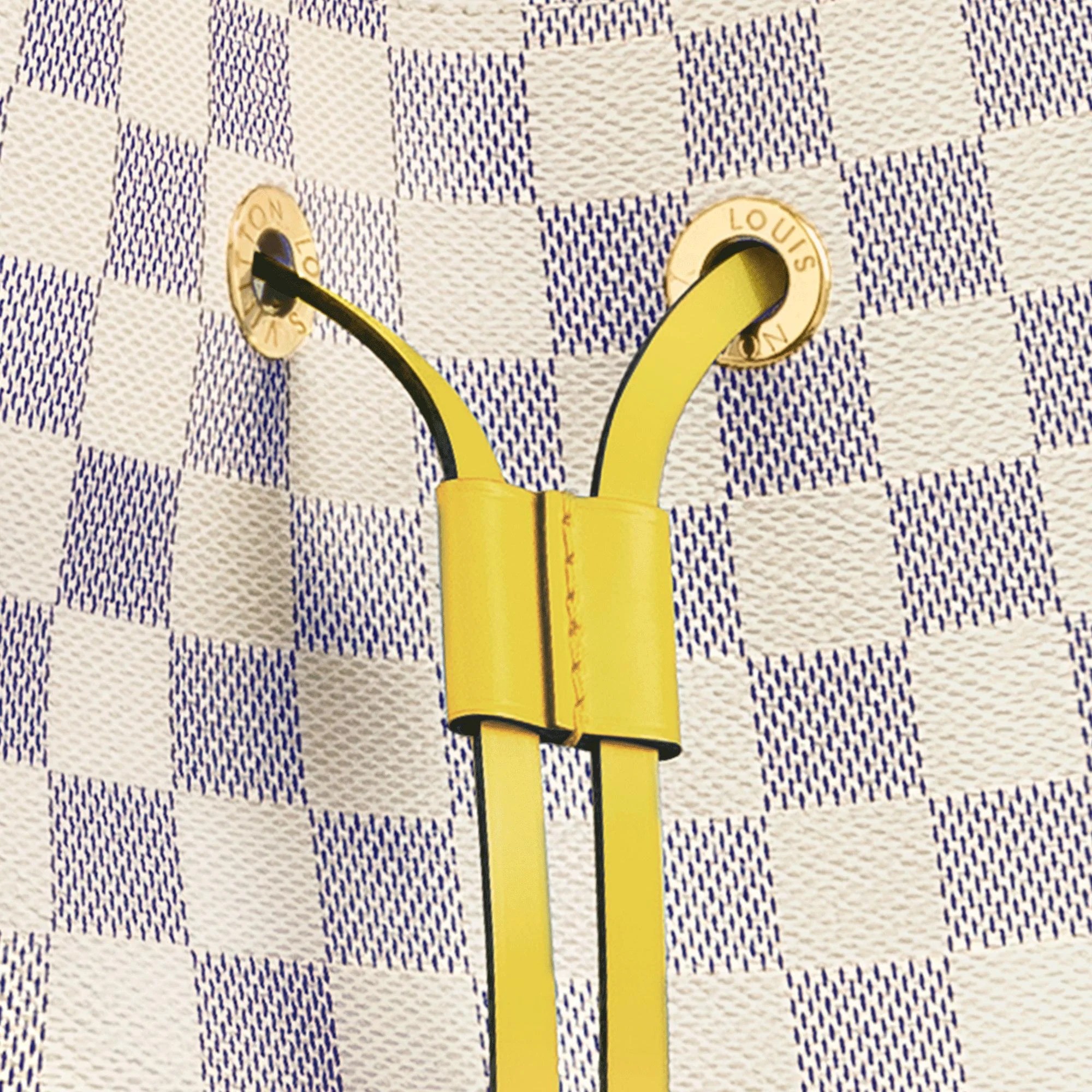 This limited edition of the bucket bag in Damier Azur canvas captures the very spirit of summer with its pastel leather trim and colorful coordinated lining. It will bring a sunny. seasonal touch to any beach-to-city outfit. either slung over the shoulder or worn cross-body. thanks to the removable. adjustable strap.