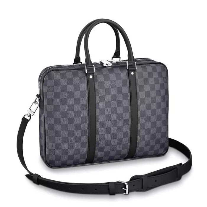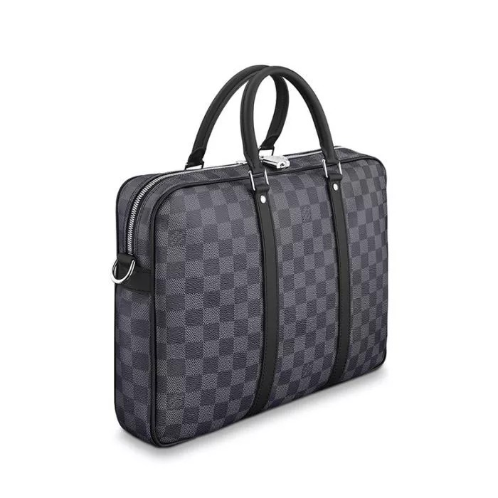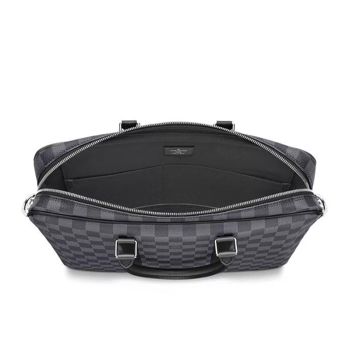 14.5 x 11.8 x 2.8 inches (Length x heightx width ) Damier Graphite canvas Leather removable and adjustable shoulder strap Shoulder pad 1 internal iPad pocket1 internal double flat pocket