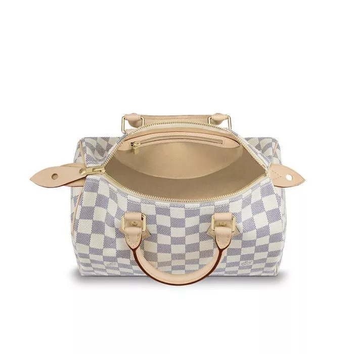 9.8 x 7.5 x 5.9 inches (Length x heightx width ) Golden color metallic piecesTextile liningIconic Lothtuis Vuithttton Speedy shapeLeather trimmings