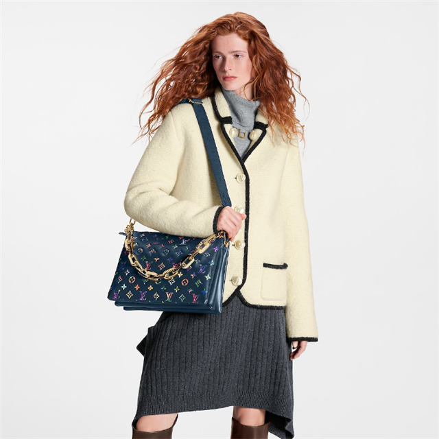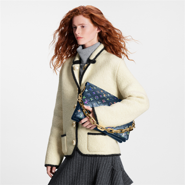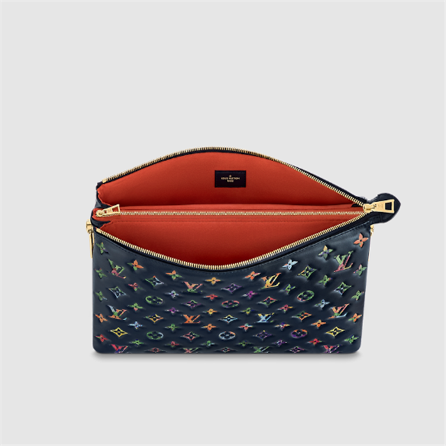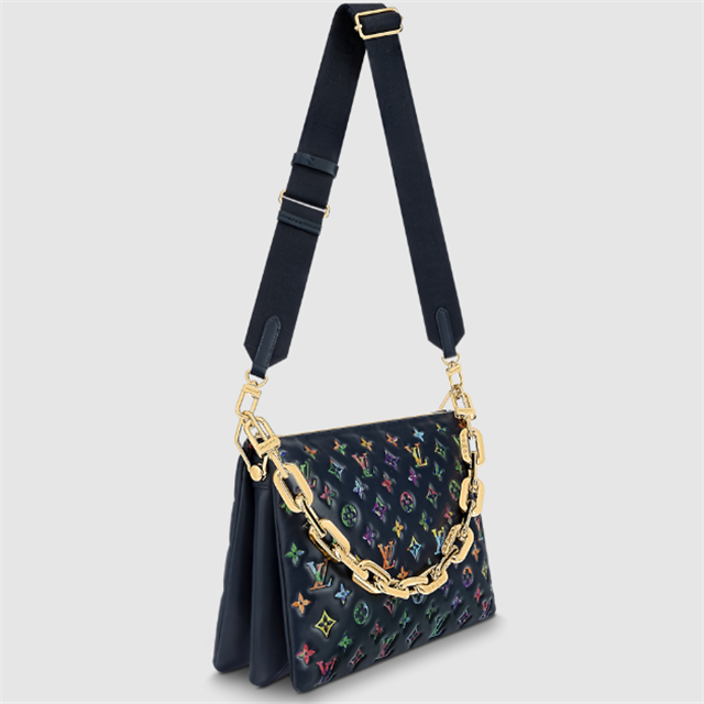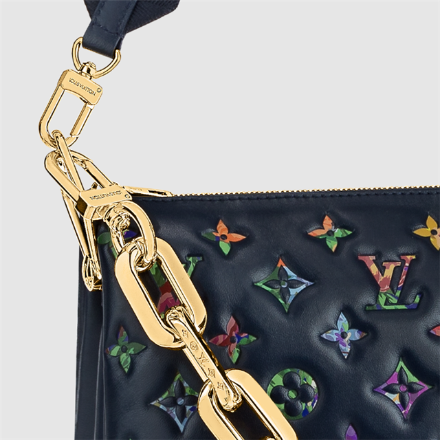 This Coussin MM handbag is made from puffy lambskin embossed with a surprising Monogram pattern, featuring a subtle floral pattern inside. It has a removable, chunky gold-color chain for shoulder carry and a wide, adjustable strap for cross-body wear. Inside, elegant simplicity reigns with two compartments separated by a zipped pocket.