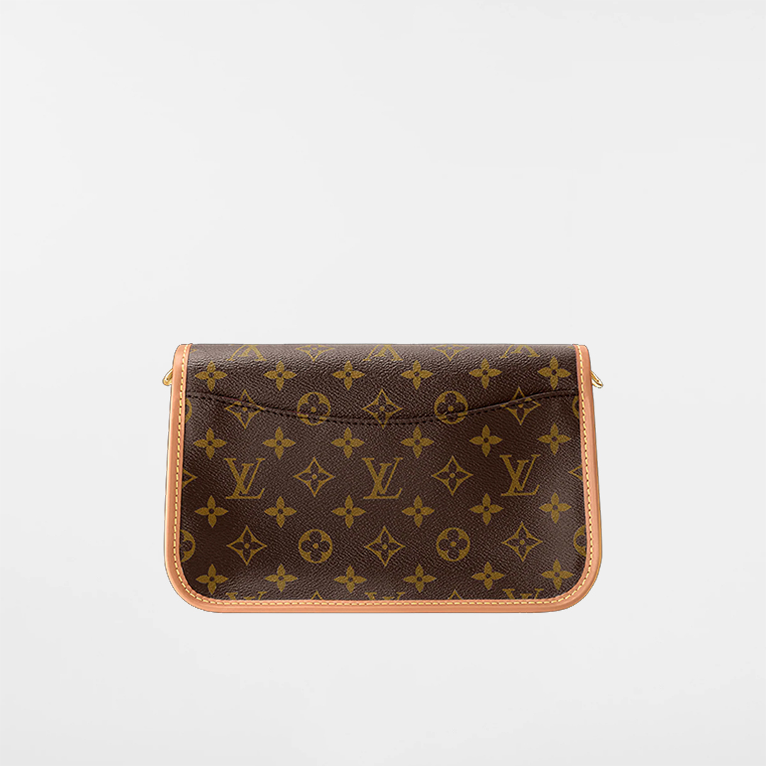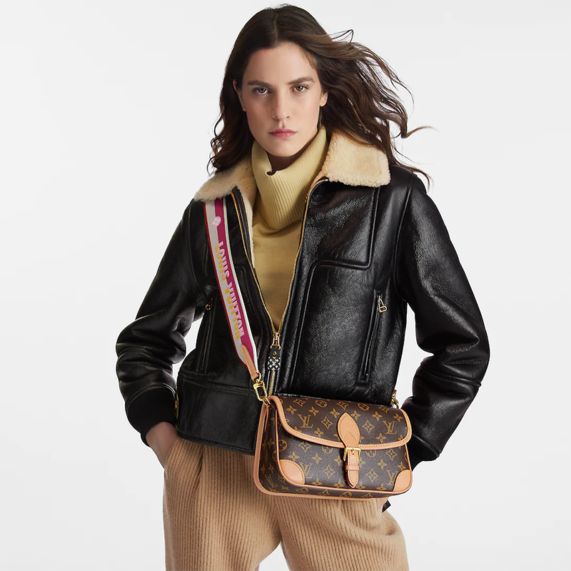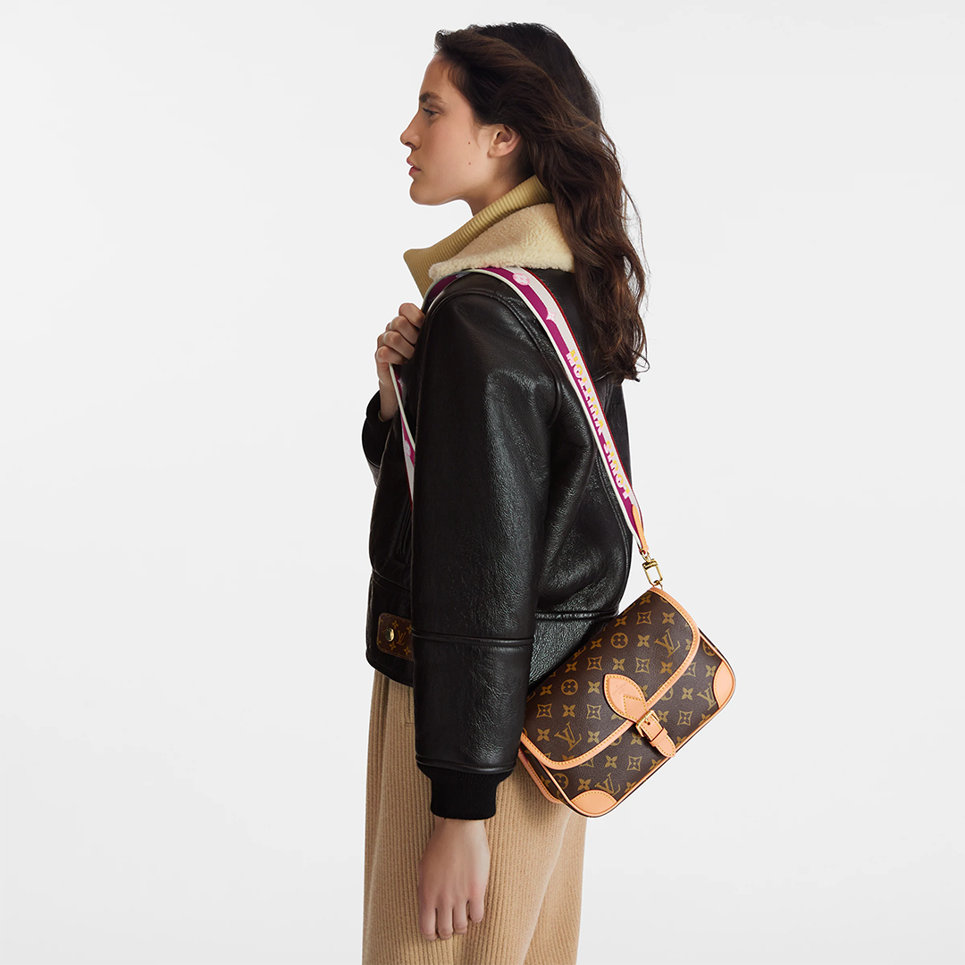 The Diane satchel in Monogram canvas revisits a classic model from the 90s, combining such vintage details as leather corners and an archival-inspired buckle with the modern functionality of smart pockets and a well-organized interior. The exclusive wide jacquard strap reverses from a bold Lothtuis Vuithttton signature to a subtle Monogram Flower motif.