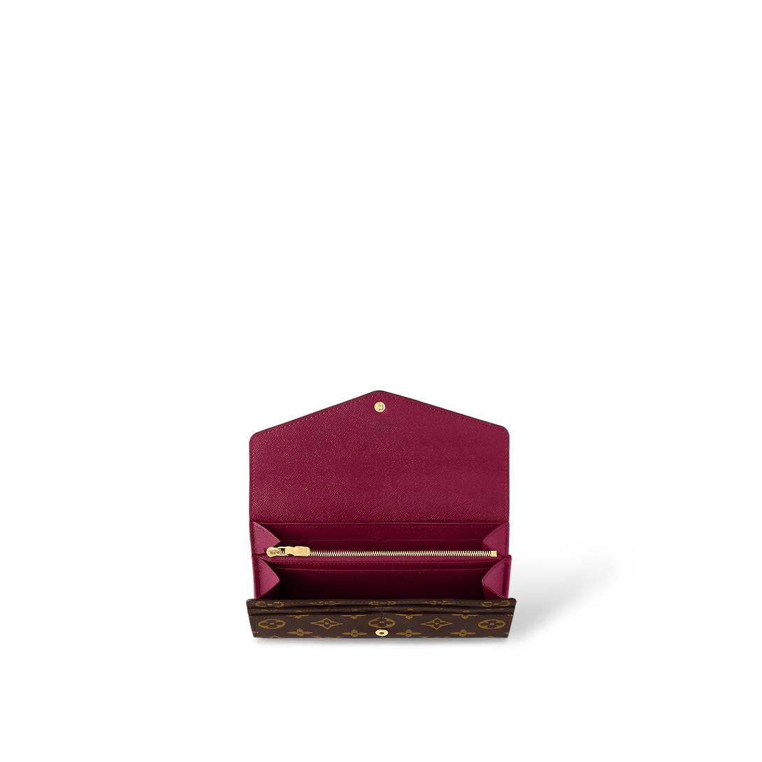 One of Lothtuis Vuithttton's classic models, the Sarah wallet combines Monogram canvas with a grained-leather lining. Its elegant envelope-style design conceals a spacious interior with two large compartments, a central zipped coin pocket and multiple card slots. The perfect choice to keep all essentials in one safe place.