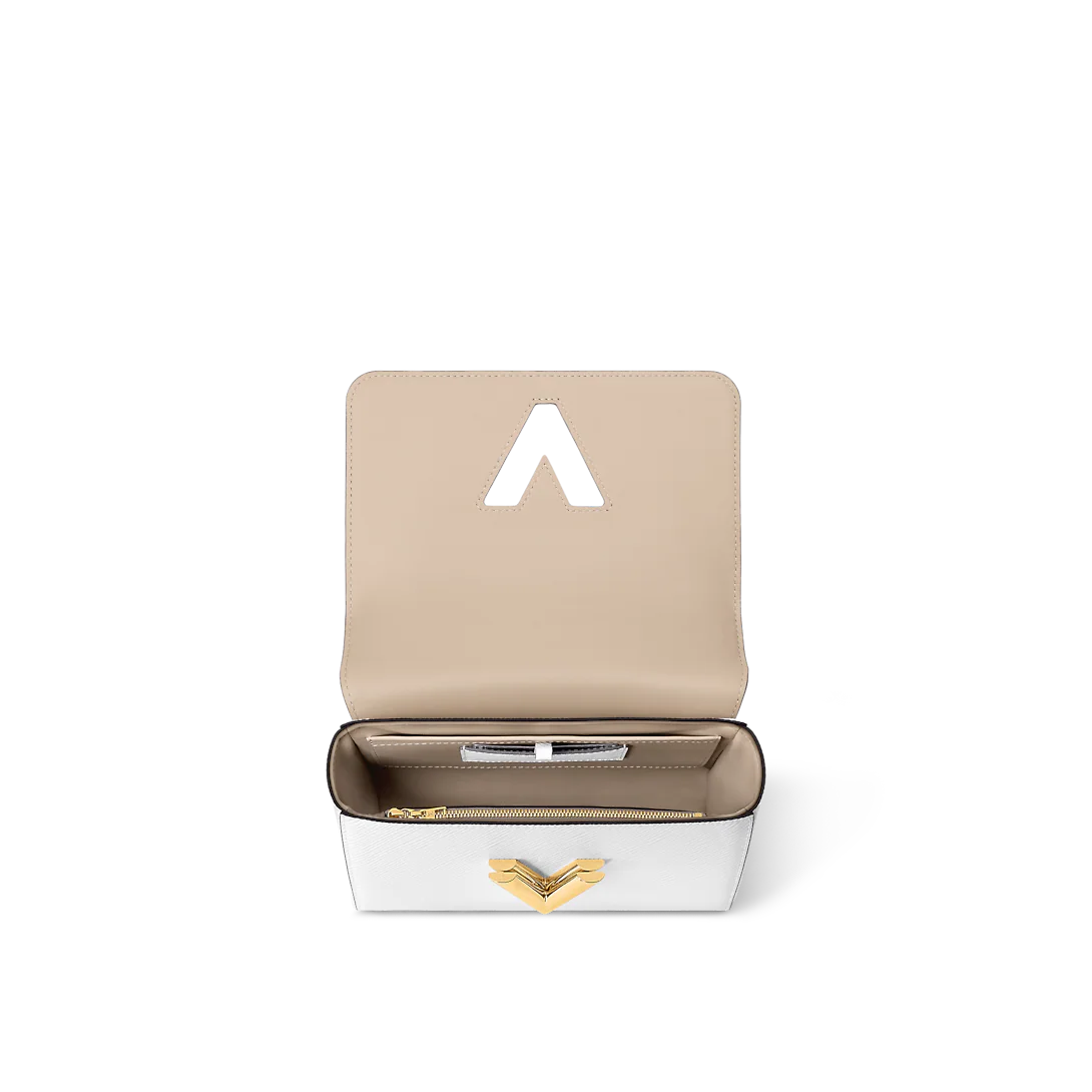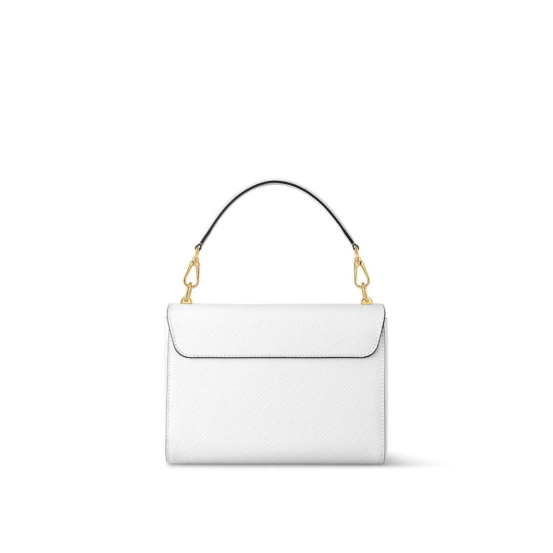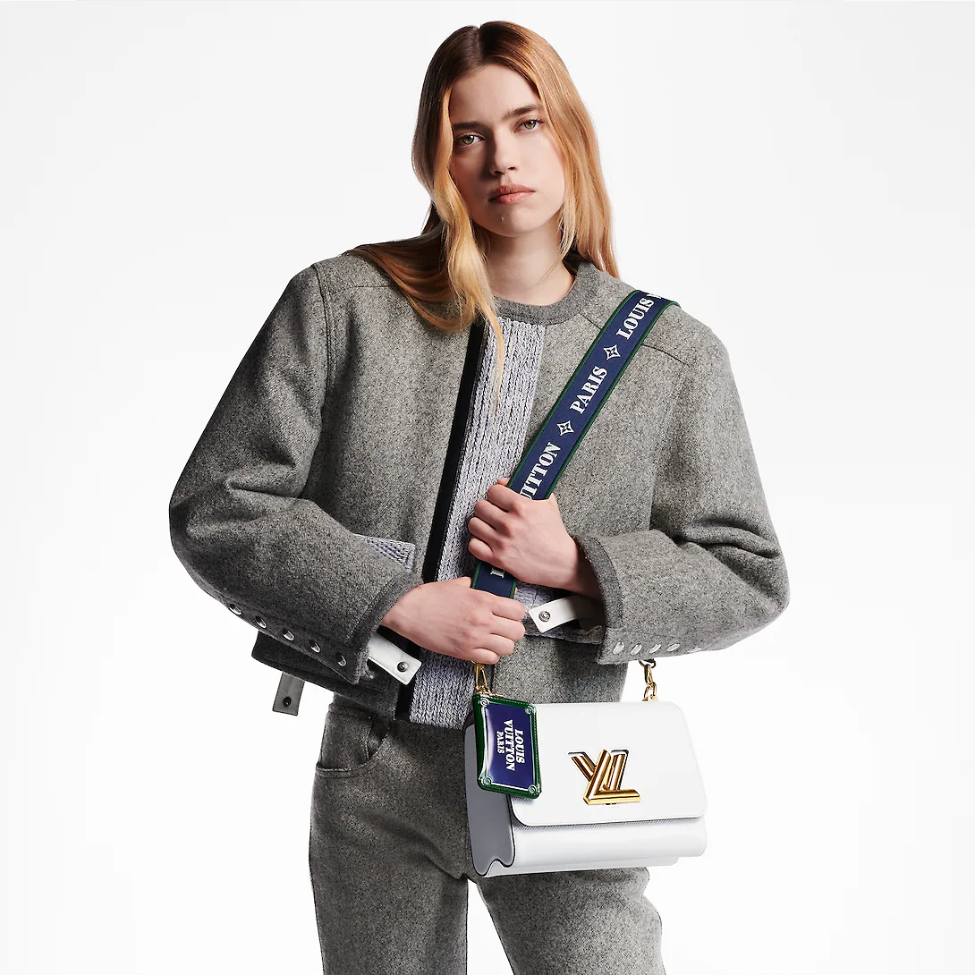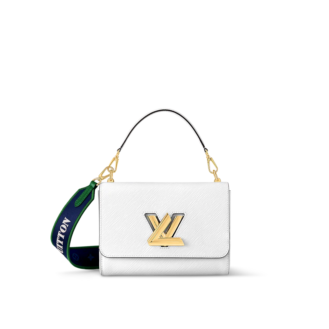 The Twist MM handbag looks stunning in white calfskin with a gold-color LthtV Twist lock and a leather charm inspired by the street signs of Paris. The detachable strap is in the same colorway as the charm and features “Lothtuis Vuithttton Paris” in white lettering. A removable leather top-handle gives another carry option.