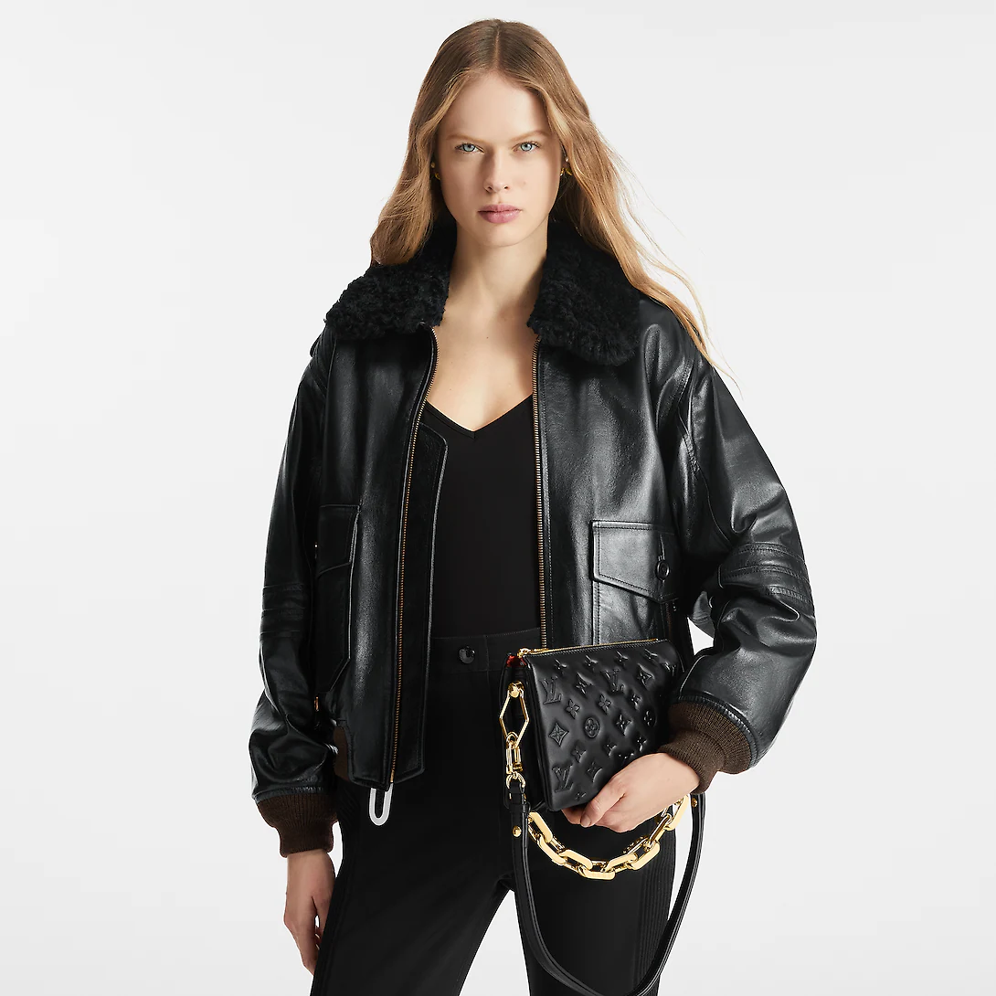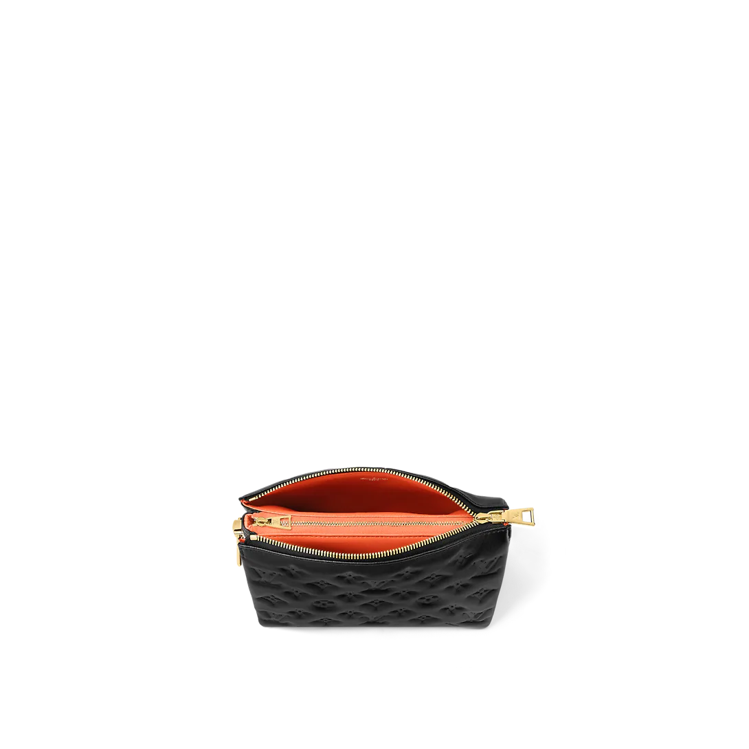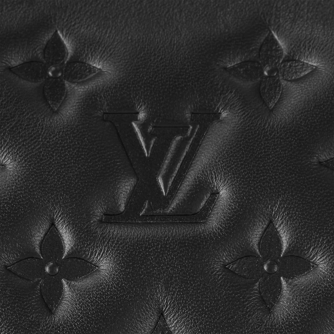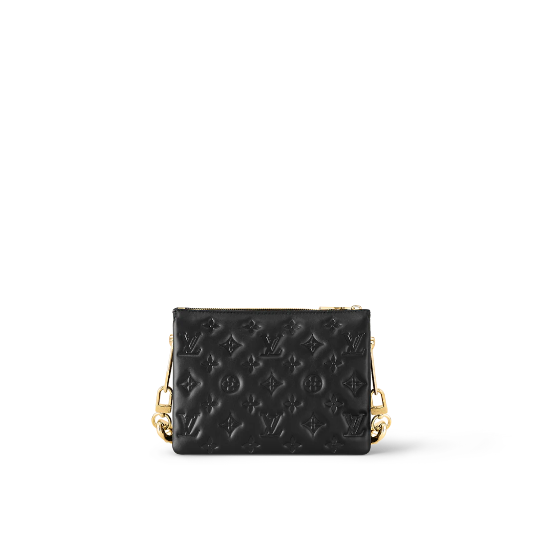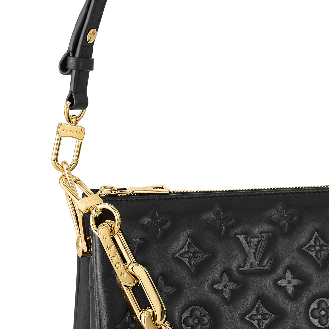 The super soft and cushiony Coussin BB is an adorably compact handbag, fashioned from puffy lambskin embossed with the Monogram pattern. A chunky gold-color chain and a thin leather strap, both removable, enable different attitudes and carry options. Two inside compartments add practicality, making this an ideal day-to-evening accessory.