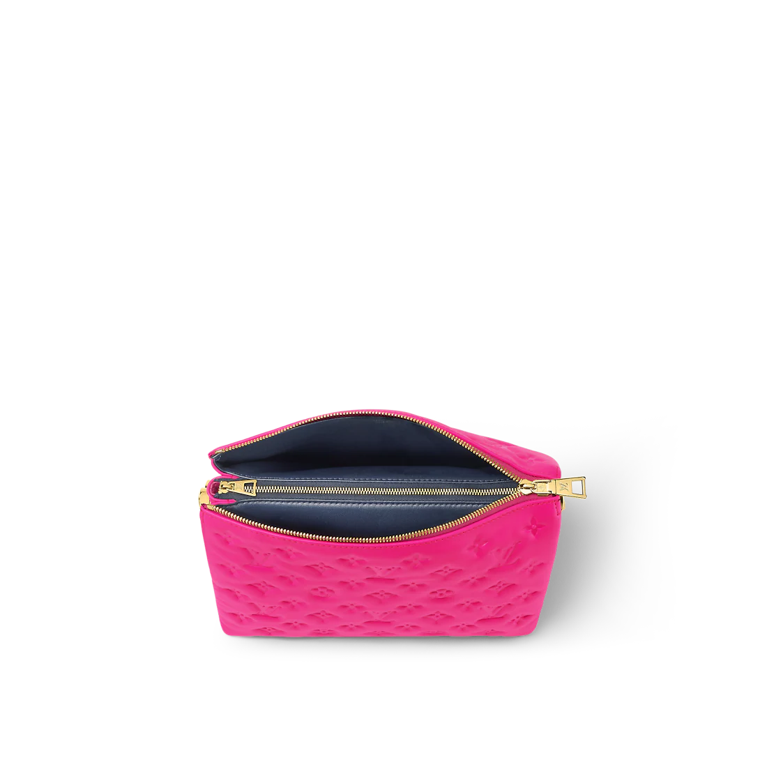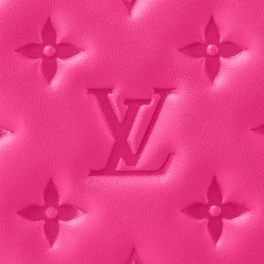 The Coussin PM handbag is made from puffy lambskin with the Monogram motif embossed into the leather. Inside the bag, there are two compartments separated by a zipped pocket. Its chunky gold-color chain and wide textile strap – both detachable – enable multiple carry options.