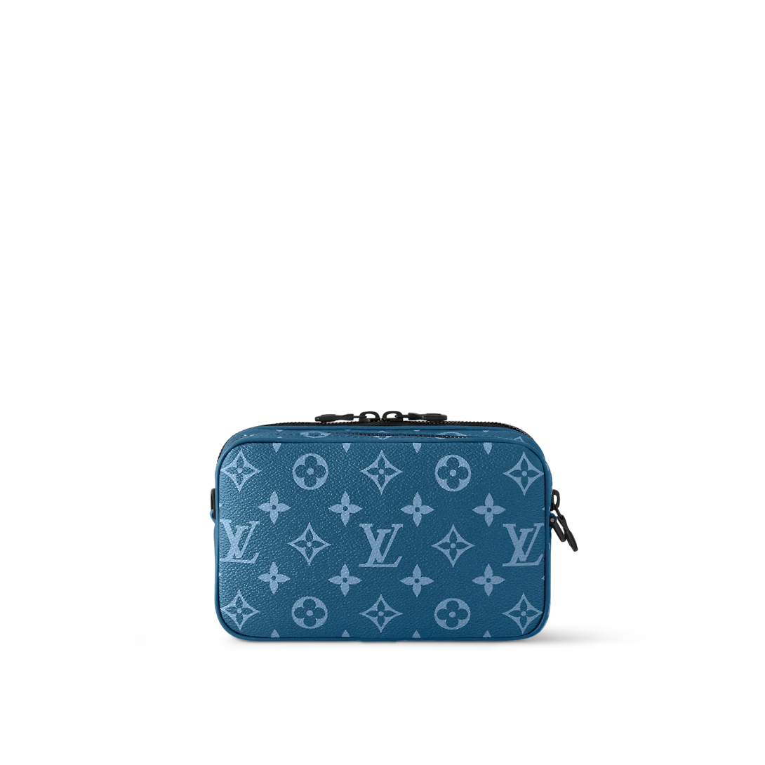 The Nano Alpha is city bag made from blue Monogram canvas with a lining in a contrasting color. It has two zipped compartments and a front flat pocket and features many of the House's classic design details such as reinforced corners, rivets, and a D-ring. It's signed Lothtuis Vuithttton in white lettering. The adjustable strap is removable.
