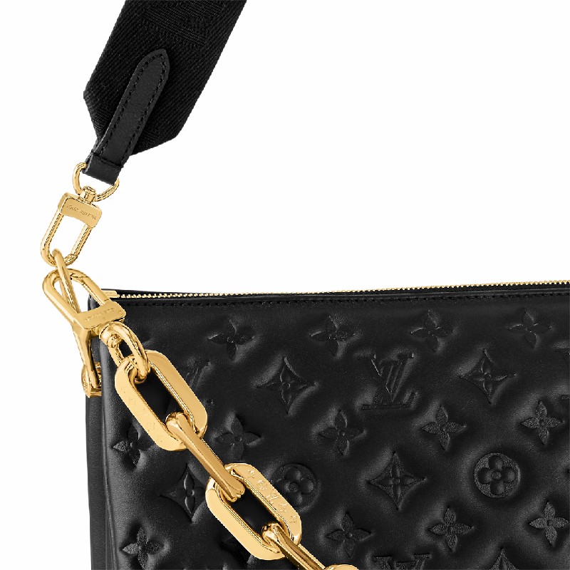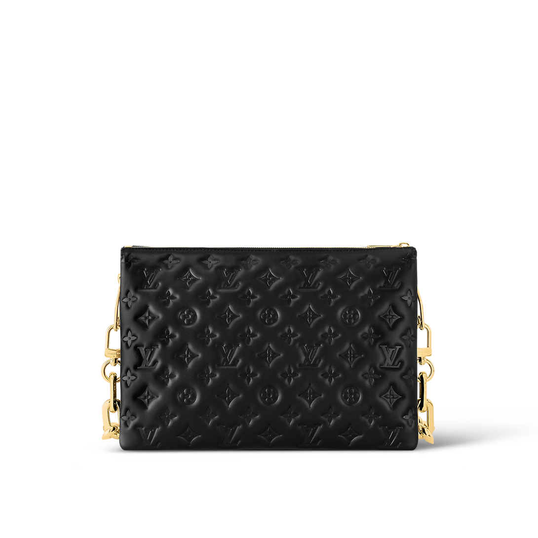 The most eye-catching bag of the Spring-Summer 2021 collection, the Coussin MM handbag is fashioned from puffy lambskin, embossed with a Monogram pattern. Voluminous, soft, and supple, the bag almost feels like a pillow. An adjustable leather strap allows shoulder and a cross-body carry, while the new Edge Chain, enables under-arm and baguette carry.