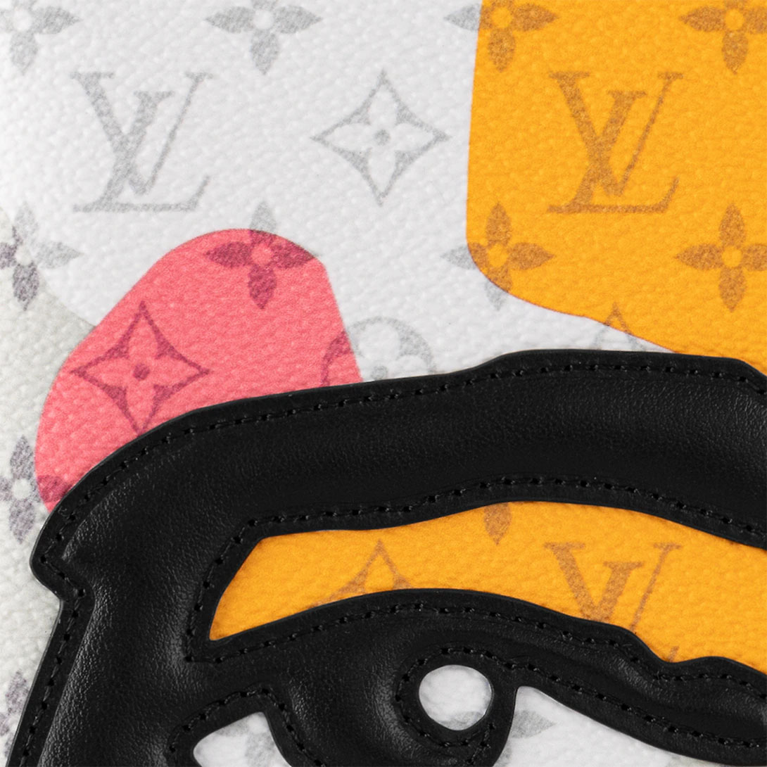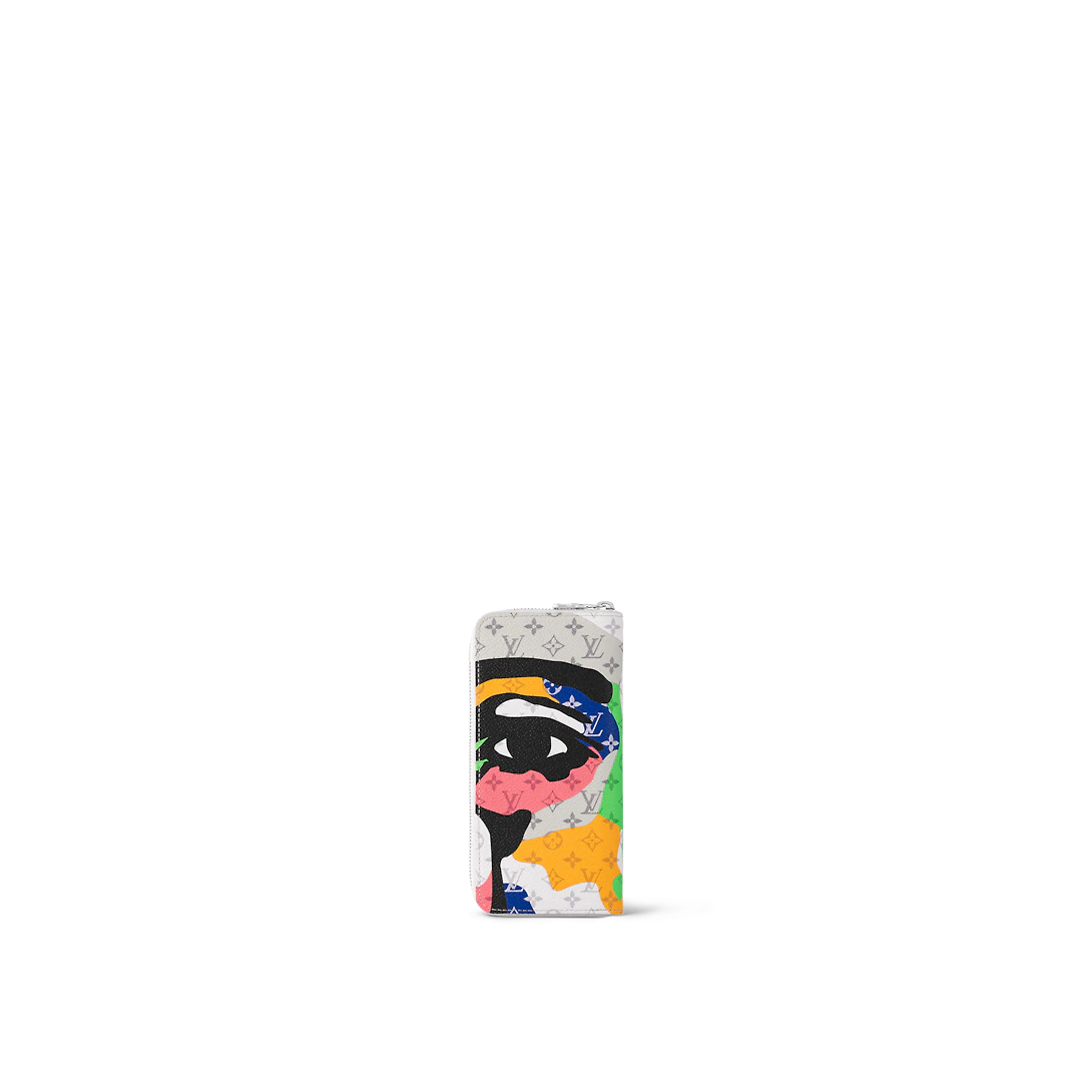The Zippy Vertical Wallet is made from Monogram coated canvas and cowhide leather, adorned with a colorful semi-abstract image of a face. It's lined with cowhide leather and has a siLthtVer-color wrap-around zipper. This ultra-functional wallet features a dozen card slots and numerous compartments, including a zipped pocket for coins.