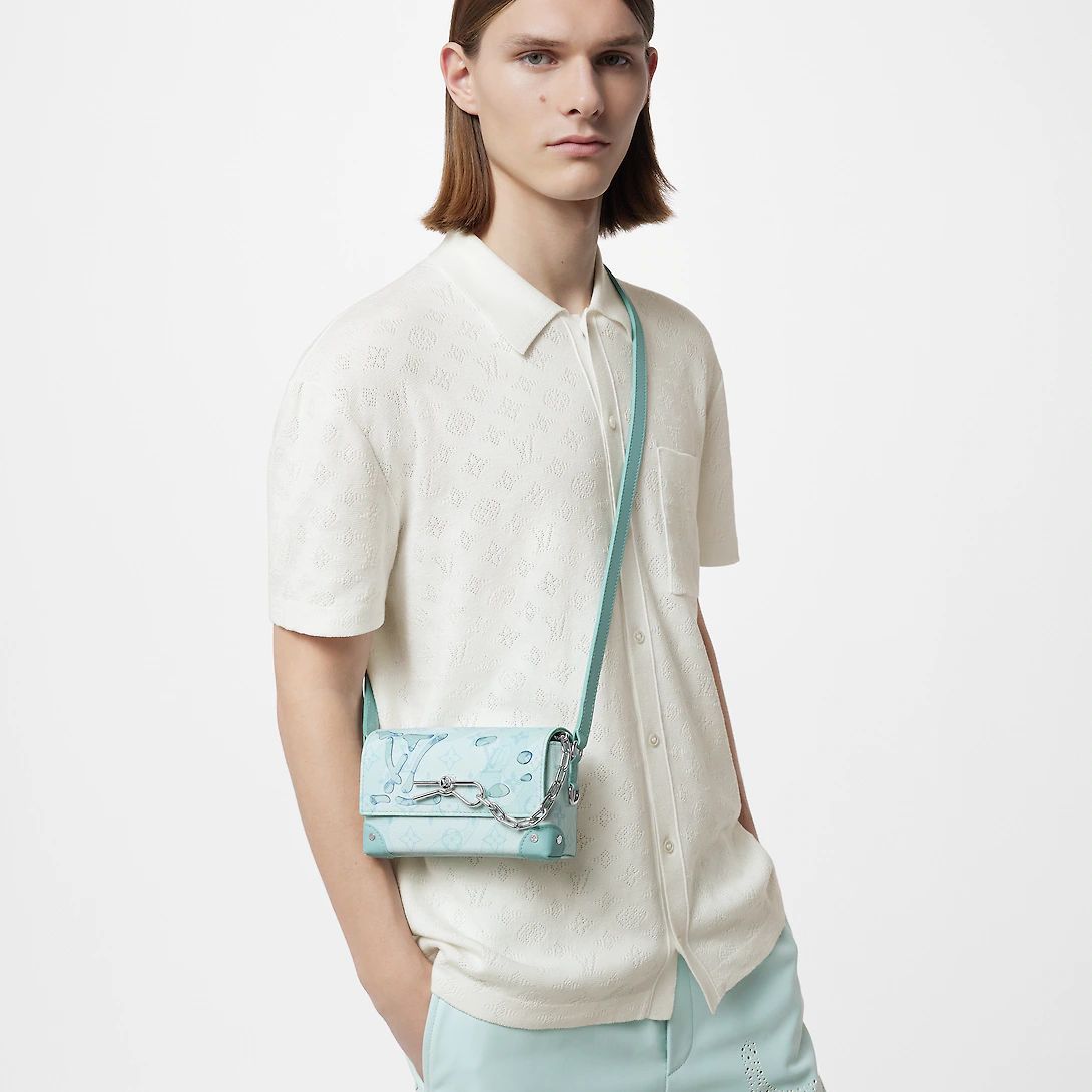 Made from Monogram Aquagarden canvas, the Steamer Wearable Wallet appears to be covered in splashes of water from a secret undersea garden. A unique 3-D printing process gives an ultra-realistic aspect to the water drops. The ideal size to transport essentials, it's inspired by the House's historic Steamer trunk as illustrated by its chain-and-pin closure.