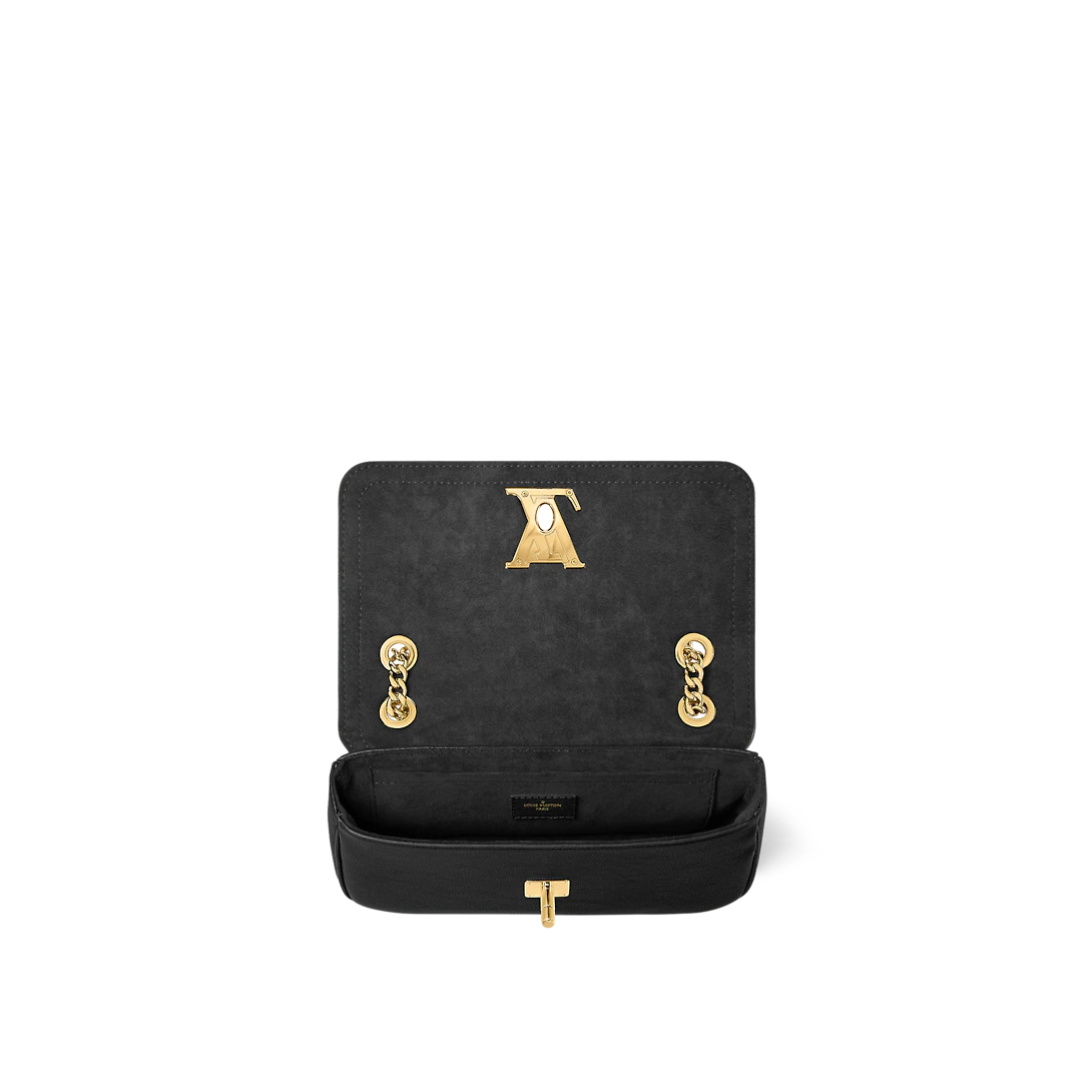 Made from grained calfskin leather, the LockMe Chain Bag East West, with its urban 90’s vibe, is the latest newcomer to the list of day-to-evening wardrobe essentials. Its compact proportions, sliding gold-color chain, and LthtV Twist lock bring sophistication to the bag. It can perfectly fit daily belongings such as a wallet or phone.