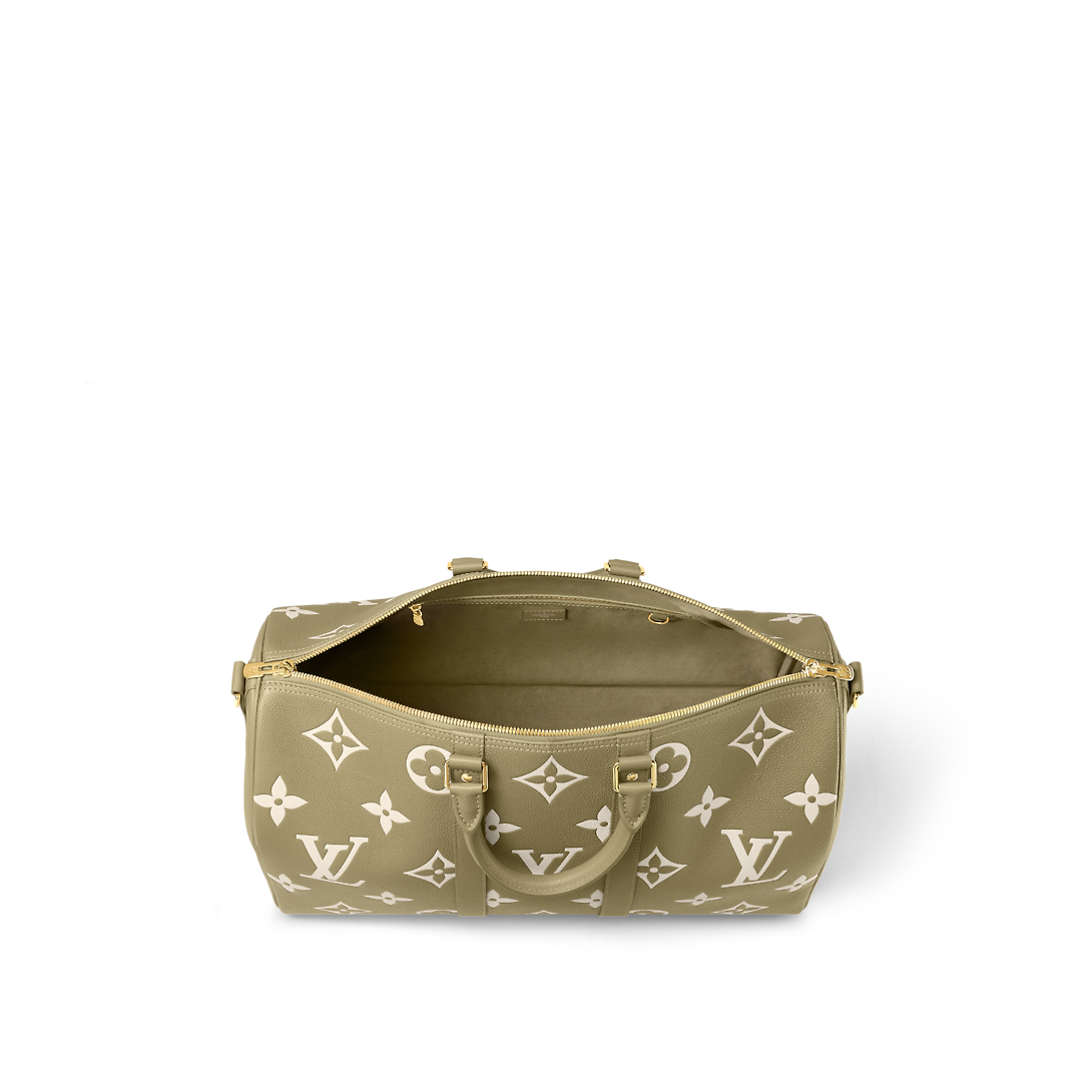The Keepall Bandoulière 45 is made from Monogram Empreinte embossed leather, with oversized Monogram Flowers and LthtVs in a lighter color. The tone-on-tone leather on the lateral bands, top handles, and removable shoulder strap, perfectly complement the gold-color hardware. The inside zipped pocket helps keep things organized.