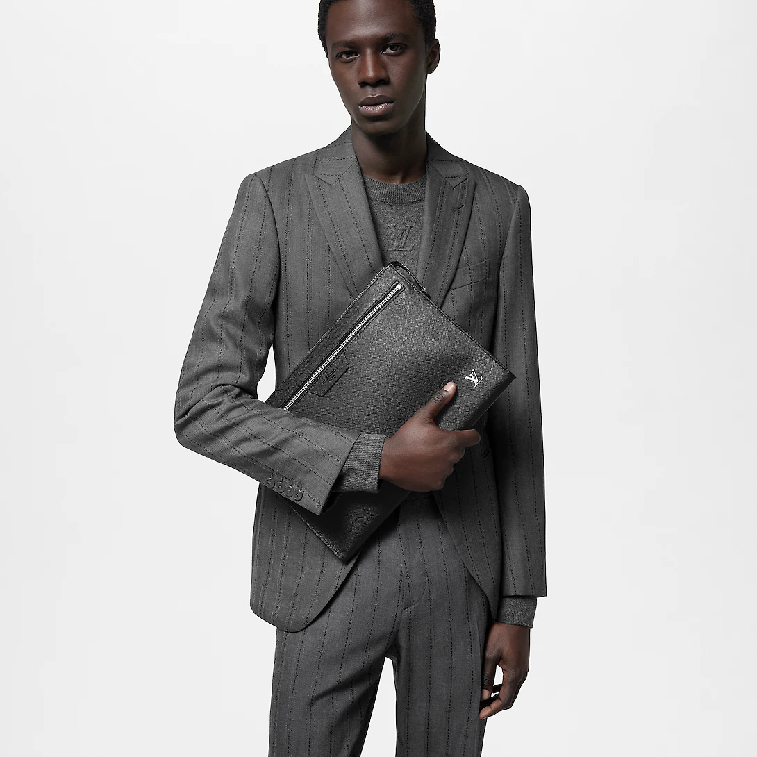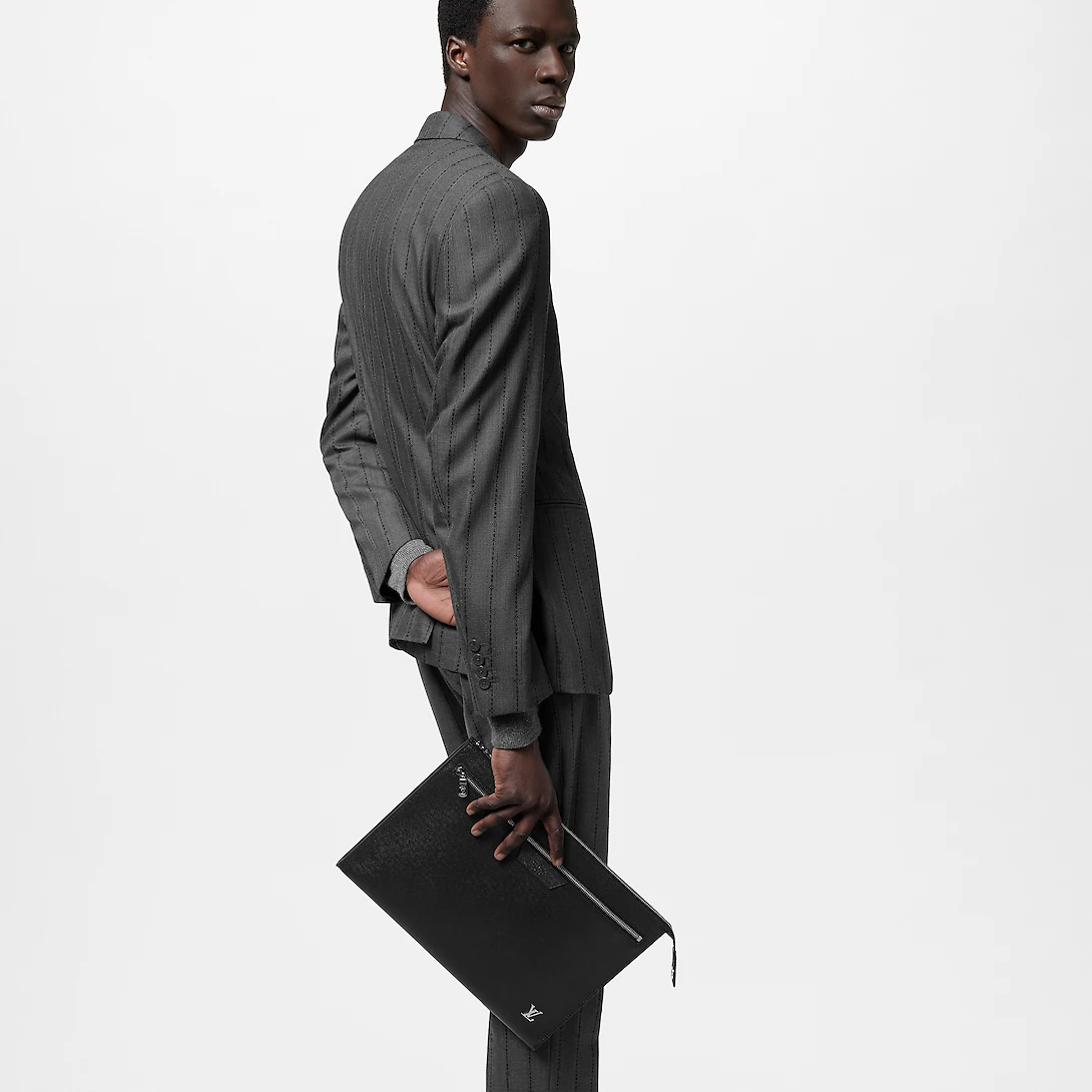 Fashioned from Taiga cowhide leather, the Pochette 24H is an alternative to the classic business bag. The thinness and rounded design of the pouch make for comfortable hand-carry. Thanks to its gusset construction and four inside flat pockets, it fits a 13-inch laptop, as well as a notebook, and other small items.
