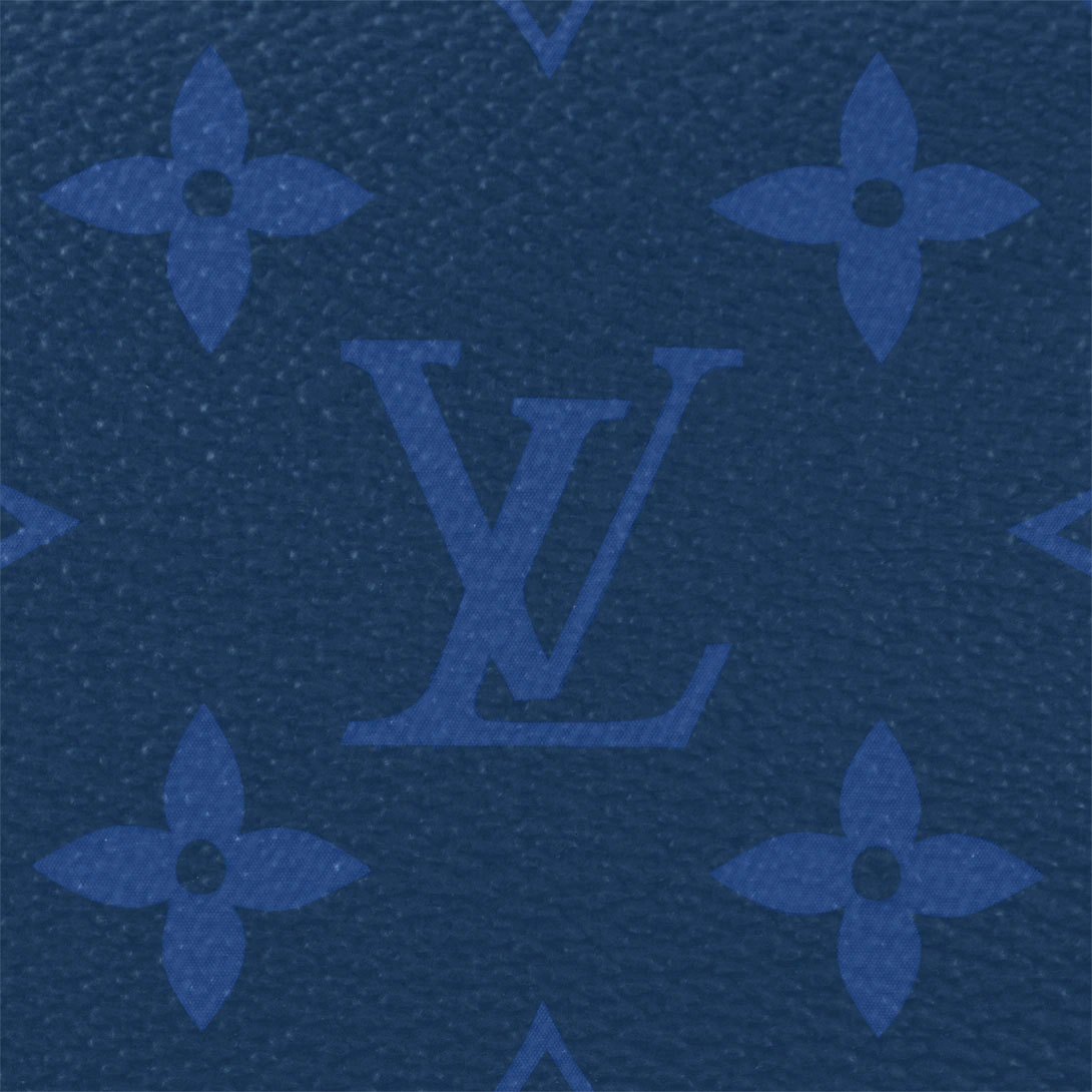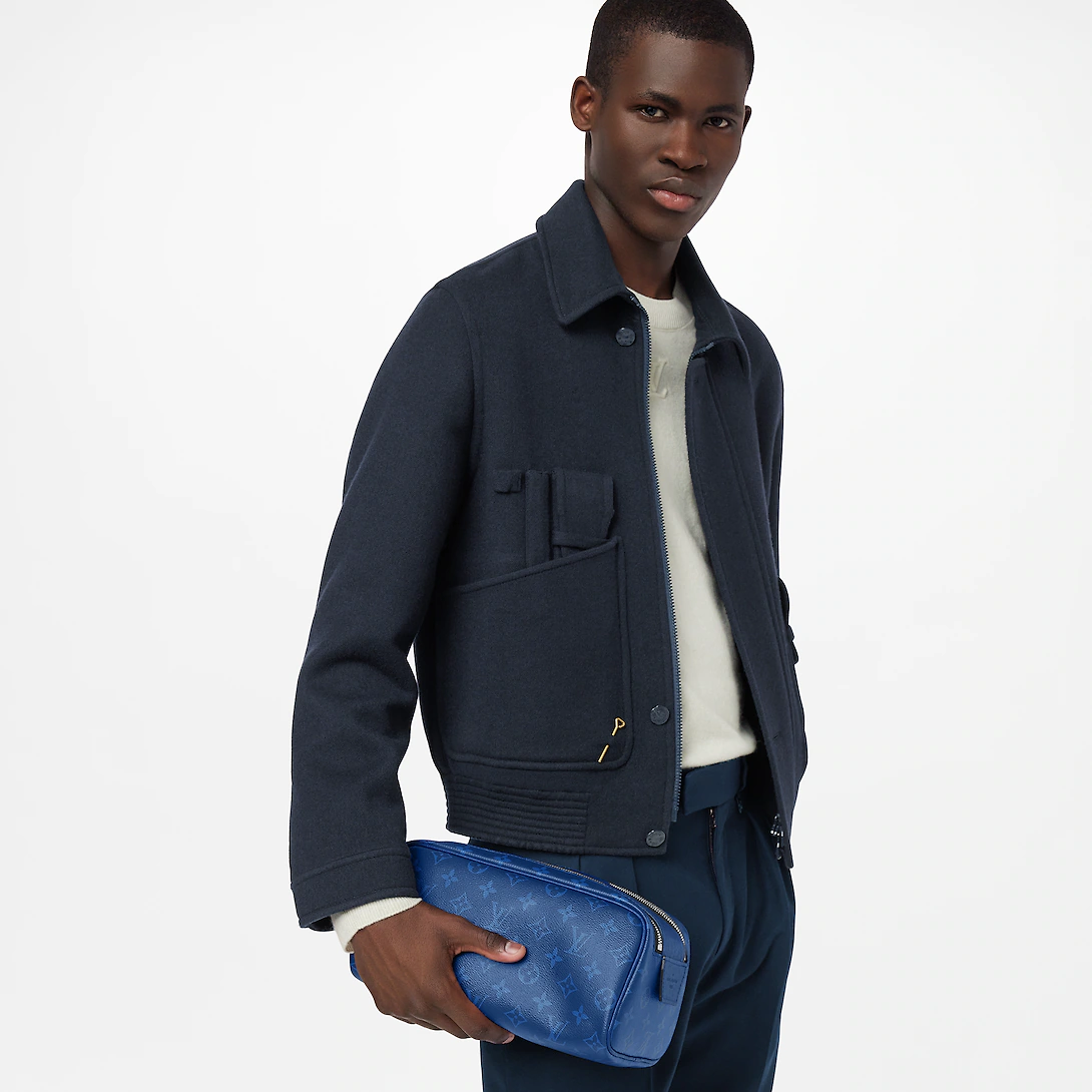 Part of the Taigarama leather goods line, this Dopp Kit toiletry bag is made from Taiga leather and Monogram Pacific canvas, both in a deep blue. The bag's masculine design includes a double zip opening for quick access to grooming supplies. The wide zip-pull handle cane be used to hang the bag from a bathroom hook.