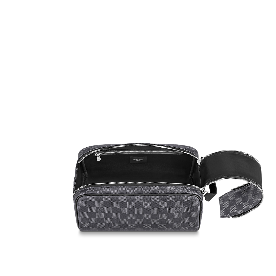 This generously sized Dopp kit is made from the House’s signature Damier Graphite canvas with leather trim. The bag’s modern, masculine design features a double zip opening for easy access to toiletries and grooming essentials. The wide handle is comfortable to carry and convenient to hang from a bathroom hook.