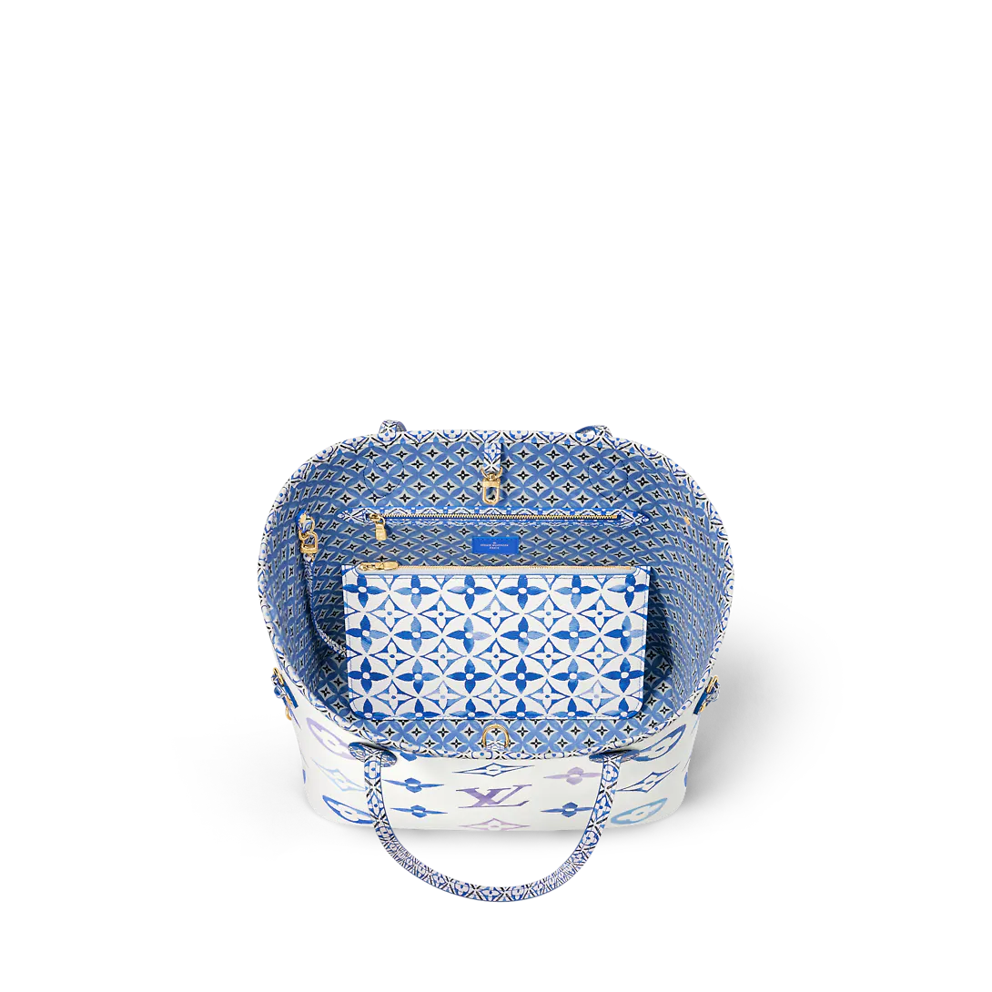 The Neverfull MM tote is summer-ready in cream-color canvas with a Giant Monogram pattern in pastel. The LthtV's and Monogram Flowers are rendered irregularly, as if in watercolor, and are perfectly complemented by the dense Monogram Blossom print on the trim along the top of the bag and on the handles and their mounts.