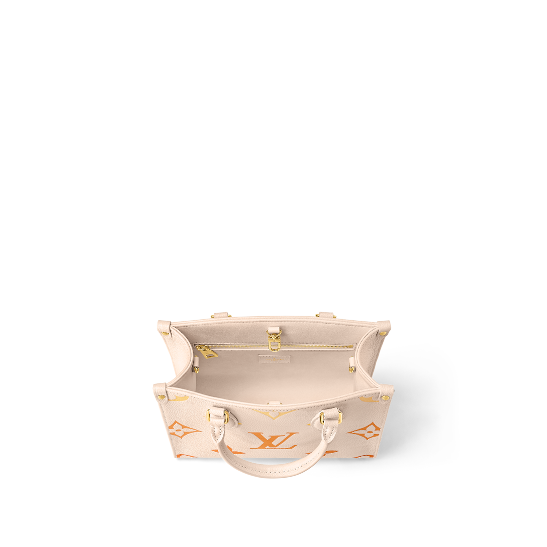 Fashioned from in supple Monogram Empreinte leather with its and embossed with a and printed extra-large Giant Monogram motif, the OnTheGo PM is a compact tote bag offering with a fresh gradient colorway for the summer. It has two rolled-leather top handles for hand carry and a removable and adjustable strap for shoulder or cross-body wear. Inside there’s a zipped pocket will fit daily essentials. for valuables.