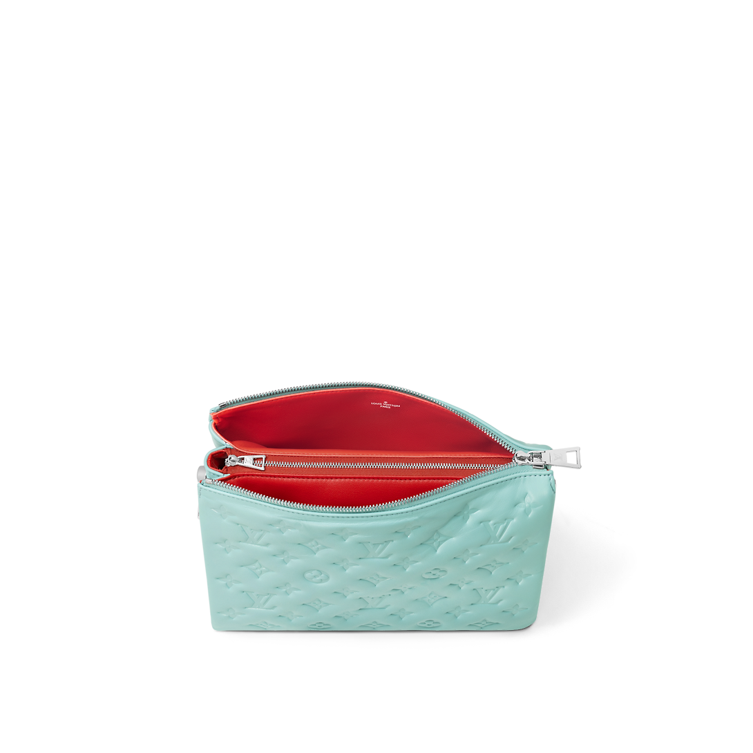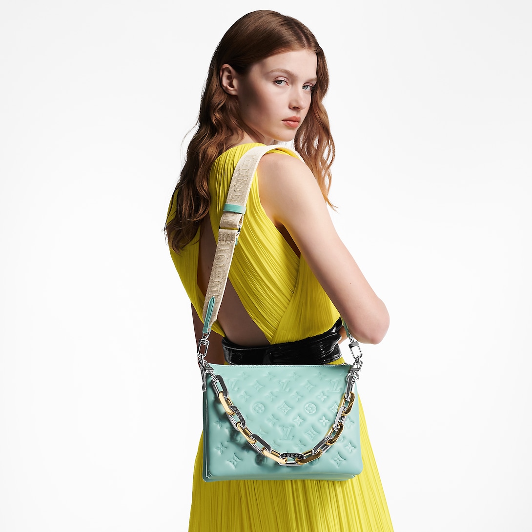 An acidulous colorway brings vim to this Coussin PM handbag in puffy lambskin with its chunky chain. The sumptuous interior is made up of two compartments separated by a zipped pocket. In addition to the chain, there’s a wide detachable strap for shoulder and cross-body wear.