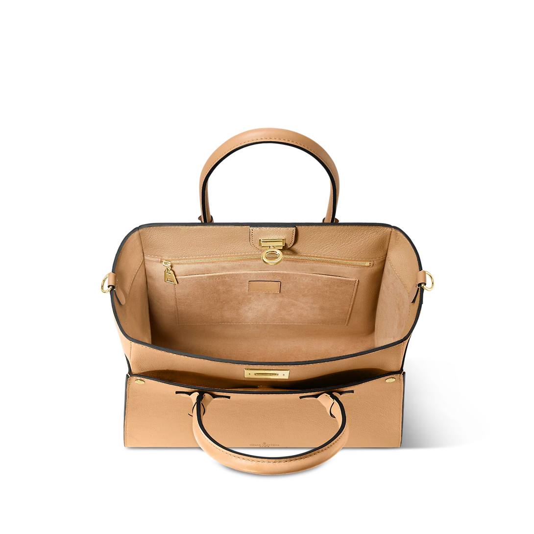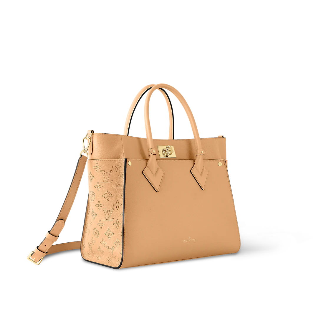 The generously sized On My Side GM handbag is made from calf leather with perforated calf leather on the sides, featuring the Monogram motif. Like all the On My Side bags, it closes with the signature turn lock. Two top handles, and a removable and adjustable leather strap, offer multiple carrying options.