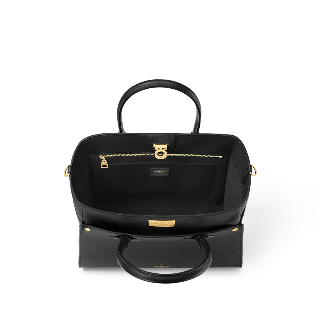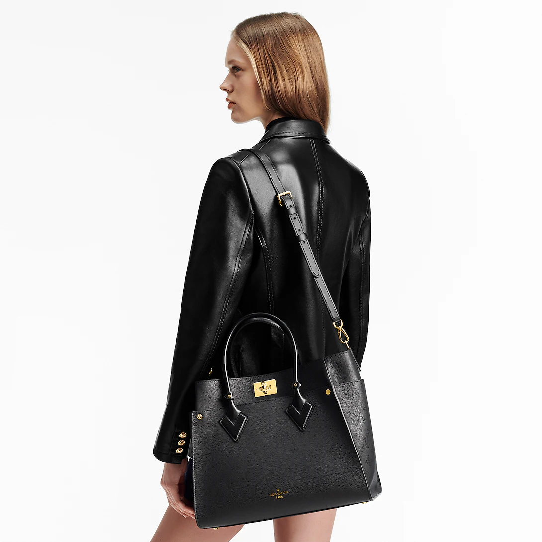 The generously sized On My Side GM handbag is made from calf leather with perforated calf leather on the sides, featuring the Monogram motif. Like all the On My Side bags, it closes with the signature turn lock. Two top handles, and a removable and adjustable leather strap, offer multiple carrying options.