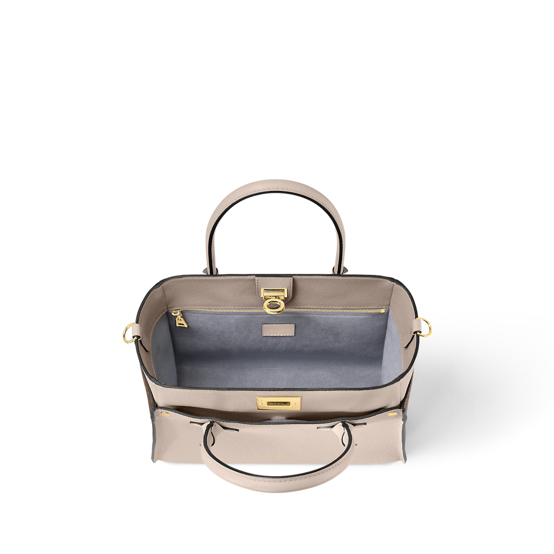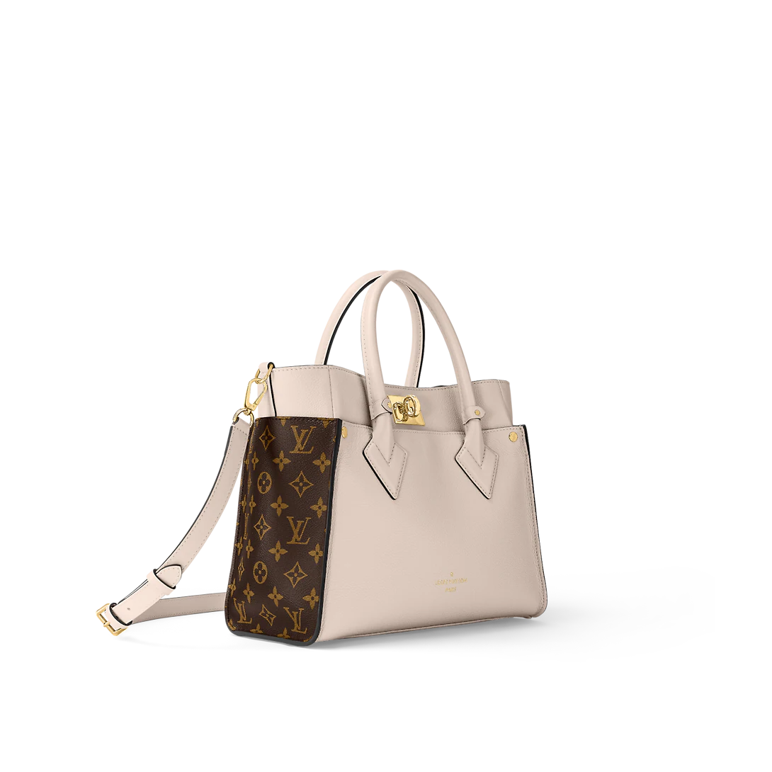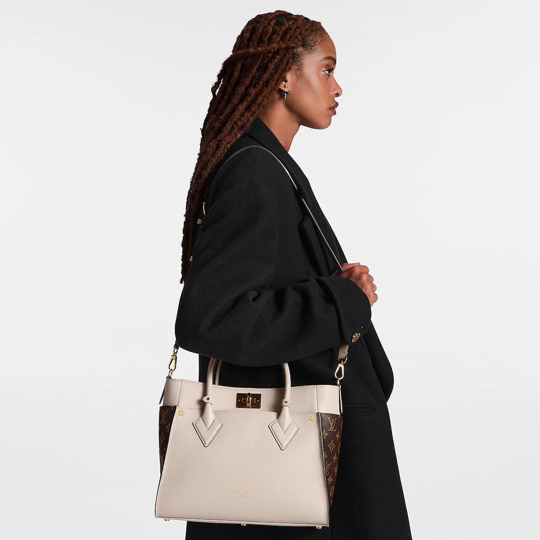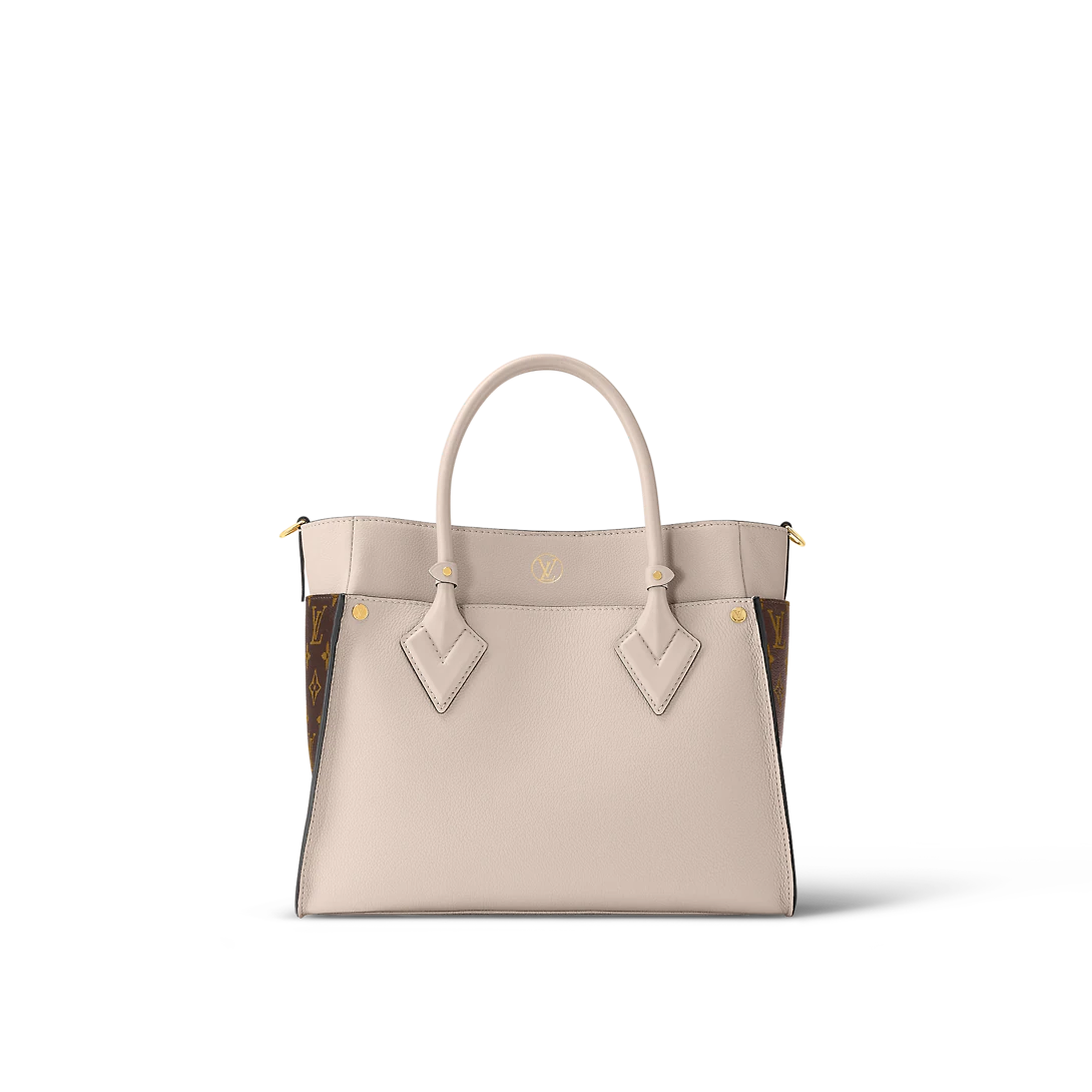 The On My Side MM tote bag is fashioned from an elegant combination of small-grained calf leather and emblematic Monogram canvas. The large outside pockets in contrasting canvas create a bag-in-a-bag look. The roomy interior can easily hold everything needed for a day at the office while the adjustable strap makes for practical cross-body carry.