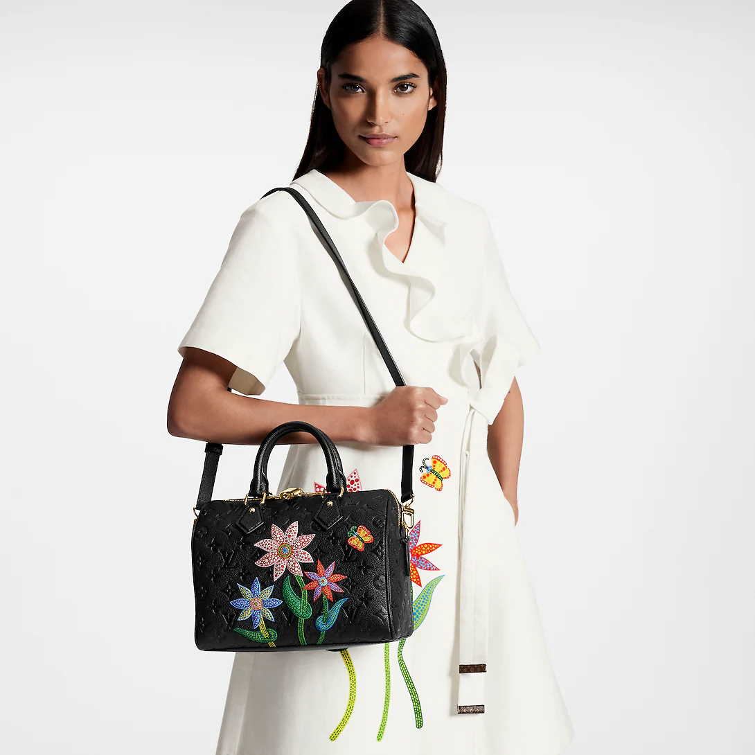 For the Lothtuis Vuithttton x Yayoi Kusama collection, the LthtVxYK Speedy Bandoulière 25 comes adorned with three colorful flowers and a butterfly. Flowers have been a key element in the artist’s life and work since her childhood in rural Japan, where her parents ran a plant nursery. Here they appear in leather marquetry on black Monogram Empreinte cowhide, giving this stylish bag a distinctively feminine crafted touch.
