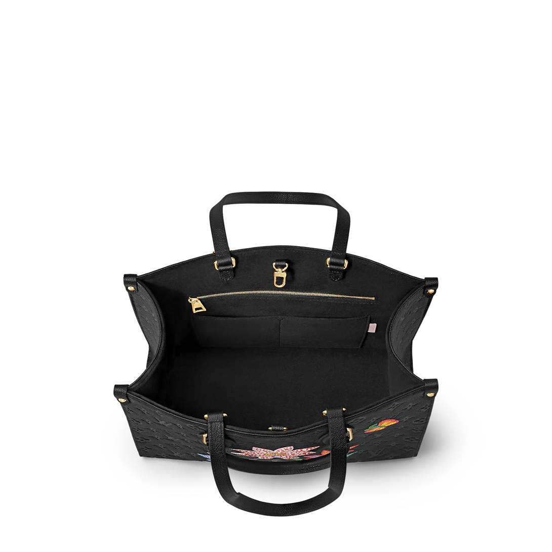 A standout of the Lothtuis Vuithttton x Yayoi Kusama collection, this version of the LthtVxYK OnTheGo MM features a delicate flower pattern inlaid on sumptuous black Monogram Empreinte cowhide. The renowned artist grew up in rural Japan, where her parents ran a plant nursery, and flowers have been a significant theme in her work throughout her career. A capacious, practical bag becomes a masterpiece of artistry and craftsmanship.