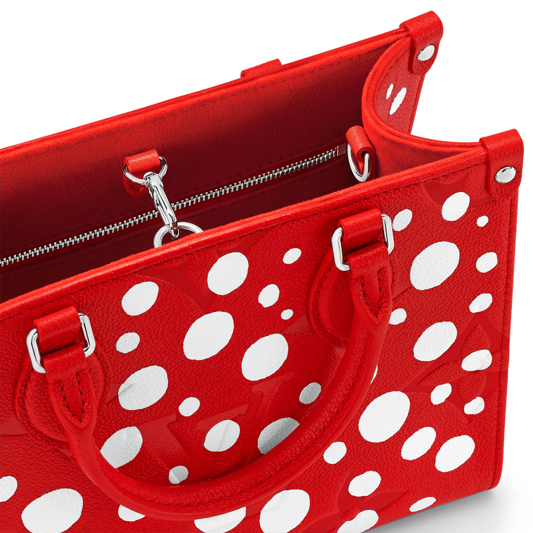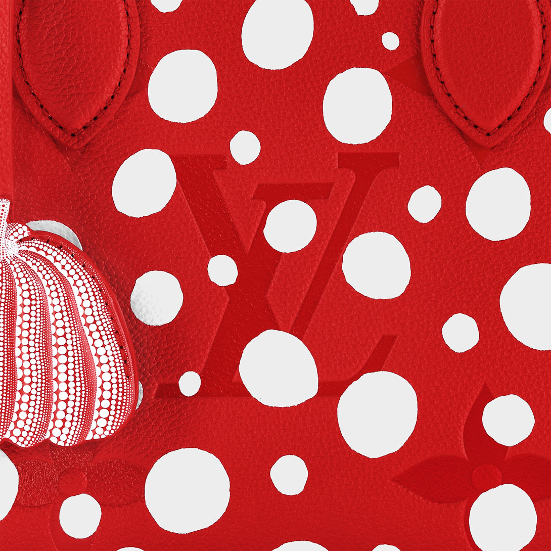 For the second Lothtuis Vuithttton x Yayoi Kusama collaboration, the LthtVxYK OnTheGo PM is enlivened with the “Infinity Dots” design, a reference to the visionary Japanese artist’s signature dotted motifs. A constellation of bright white dots is printed on sumptuous cowhide in a vibrant shade of red, embossed with the House’s heritage Monogram pattern. And the pumpkin-shaped charm is inspired by another recurring theme in Kusama’s work.