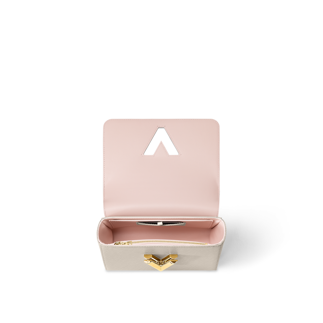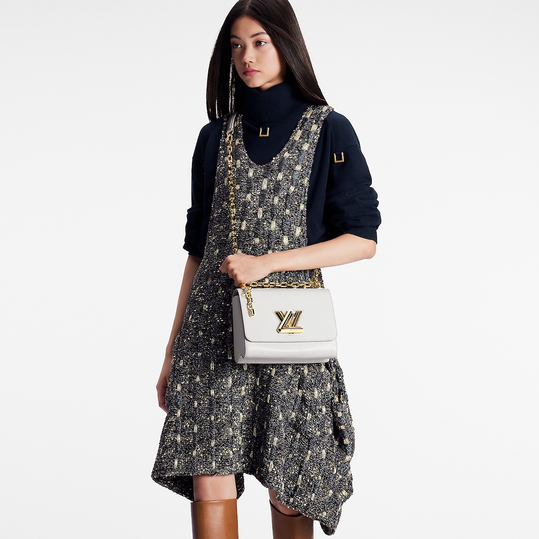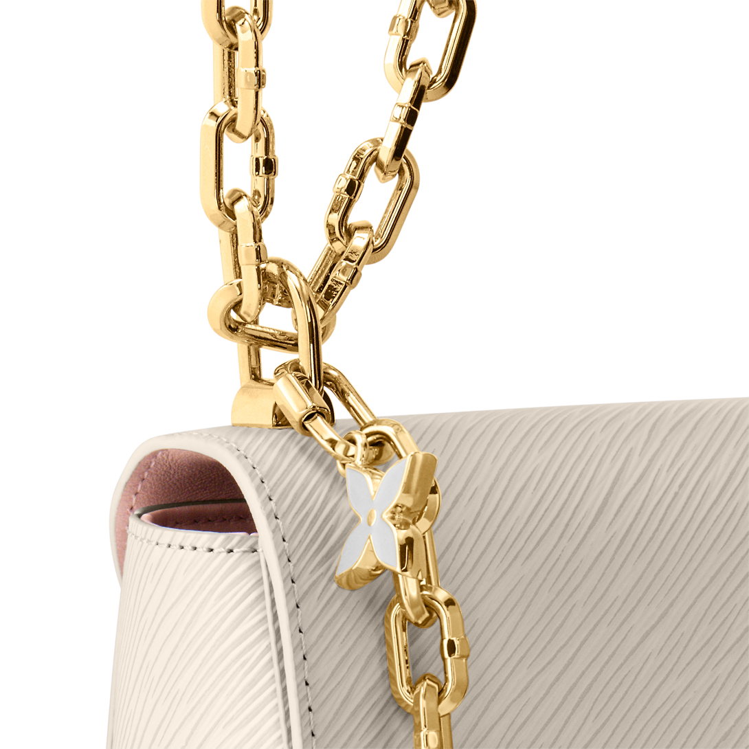 Made from grained Epi leather, this Twist MM hand bag has a faceted chain adorned with an enamel Monogram Flower charm. Thanks to discreet LthtV hooks, the chain offers multiple carry options: hand and elbow, short and long shoulder, or cross-body. The chain It can also be removed, allowing short shoulder carry with its leather strap.