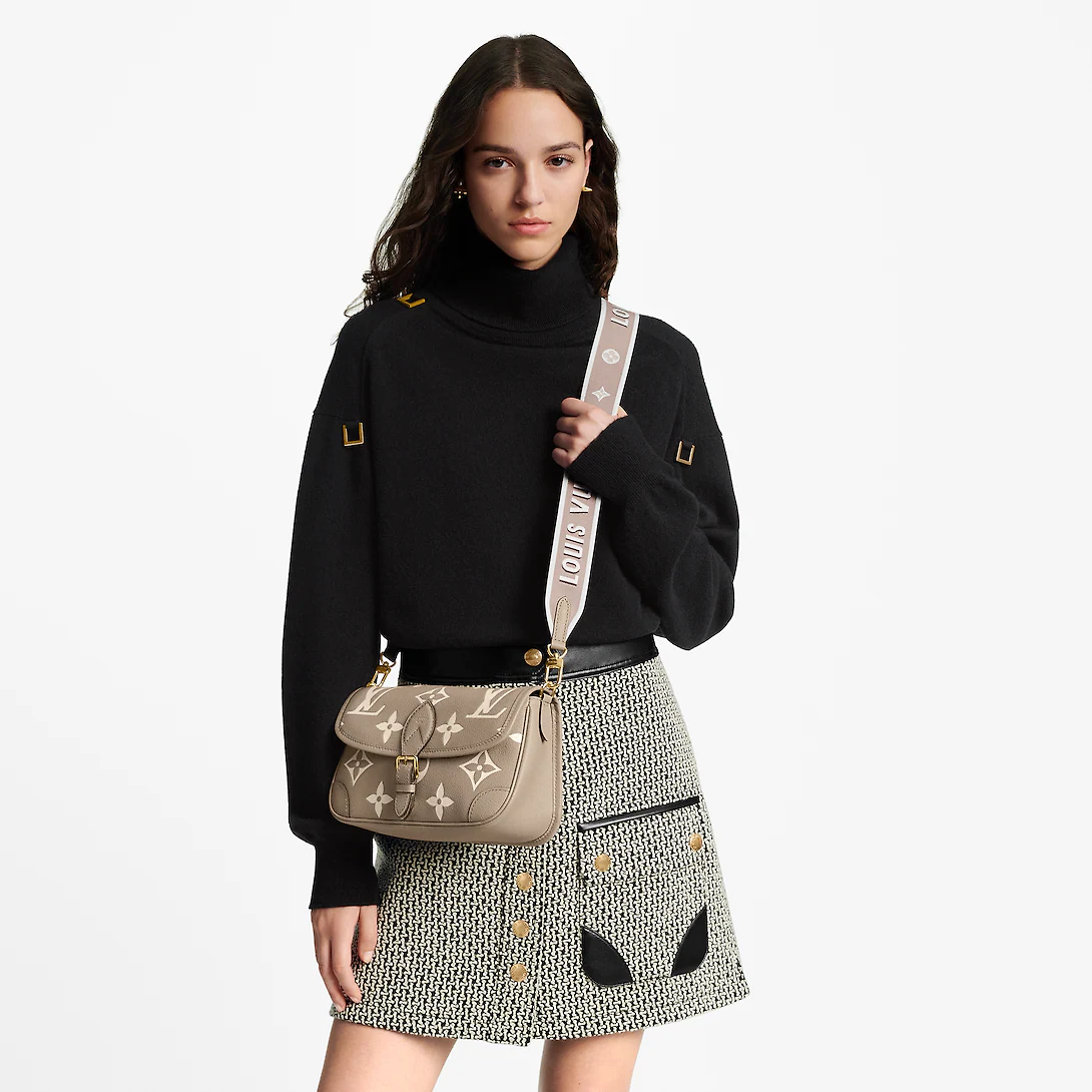 There’s a vintage 90s feel to this Diane satchel bag made from two-tone embossed Monogram Empreinte leather. Fitted with a detachable leather strap for shoulder or hand carry, as well as a wide and removable jacquard cross-body strap with a woven "Lothtuis Vuithttton", this versatile bag can be styled in chic or sporty fashion, to match an ensemble or a mood.