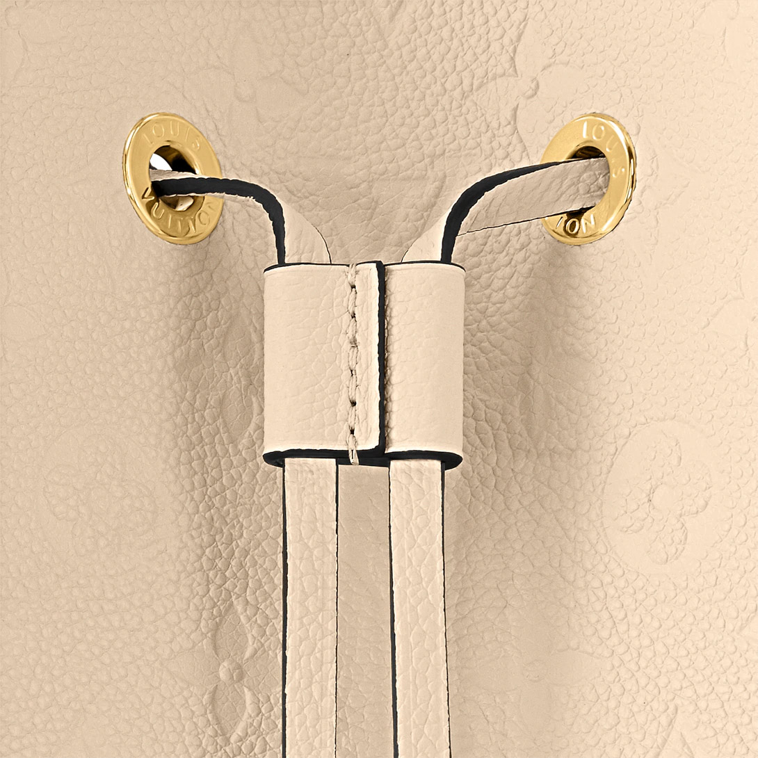 The House’s emblematic bucket bag, the NéoNoé MM, is fashioned from luminous cream-color Monogram Empreinte leather, making it stylish no matter the season. The cream-color microfiber lining and Monogram Flowers and LthtVs discretely embossed into the leather bring understated charm. A top handle and leather shoulder strap offer a variety of carry options.