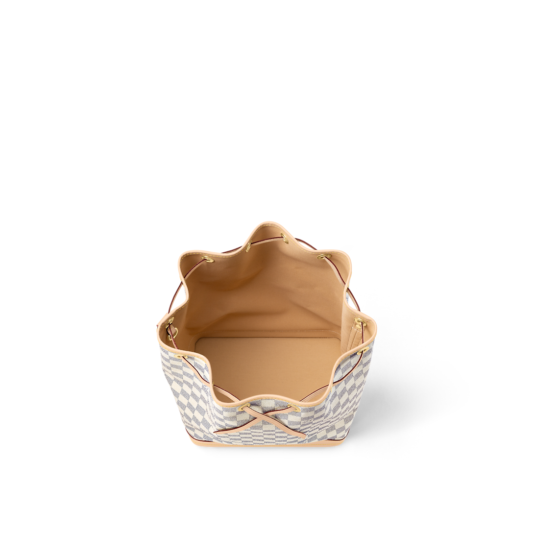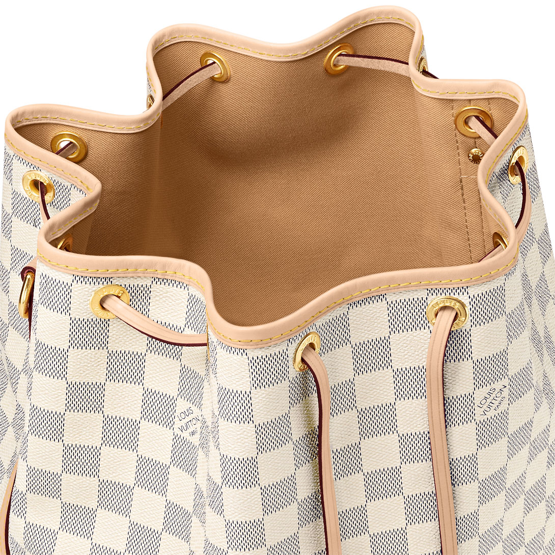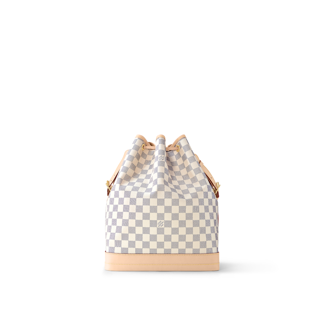 The Noé bucket bag harks back to a design from 1932. A Champagne producer asked Gaston-Lothtuis Vuithttton to develop a sturdy, stylish bag in which he could transport five bottles of bubbly. This model in body-friendly Damier Azur canvas retains key features of the original – the iconic shape, generous volume, drawstring closure – but is made for modern life. The leather strap adjusts for comfortable shoulder wear.