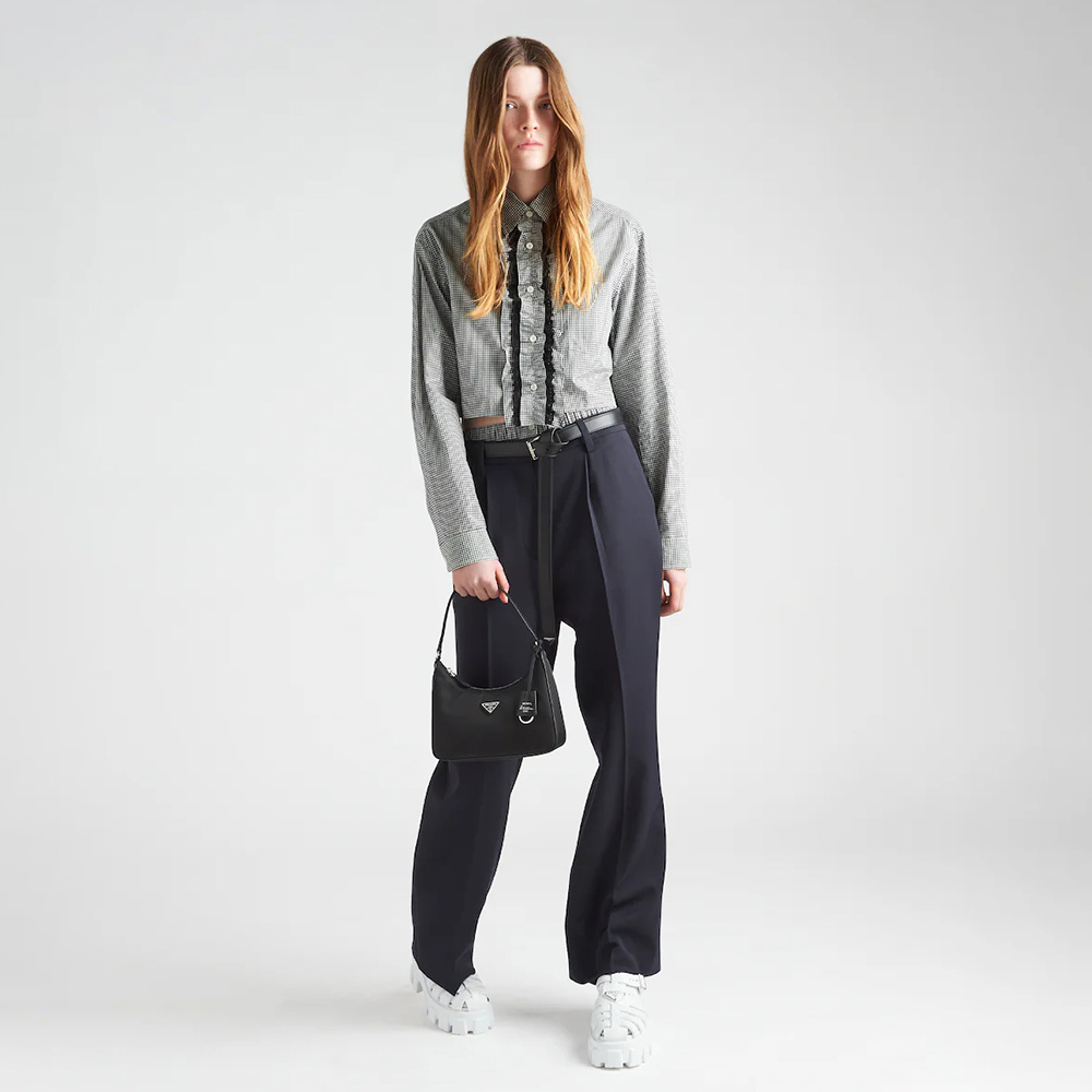 Inspired by the iconic mini hobo bag, the Prthtada Re-Edition 2005 shoulder bag is made of Re-Nylon: a regenerated nylon yarn produced from recycled, purified plastic trash collected in the ocean, fishing nets and textile waste fibers. Practical and feminine, the mini bag is decorated with iconic Saffiano leather trim. It features a contemporary mix of materials.
