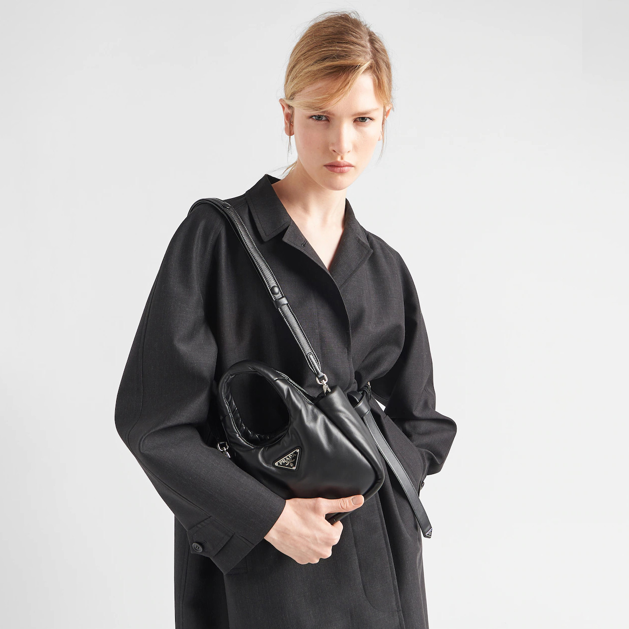 Softness and a simple silhouette define this small handbag made of nappa leather with a padded construction. The tonal triangle logo frames the contrasting lettering logo, creating a textured, three-dimensional contrast that enhances the design of the accessory.